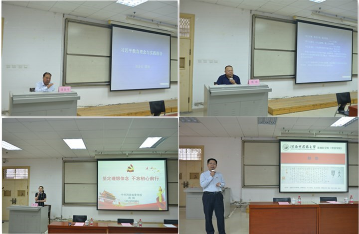 开幕式后,河南财经政法大学统计与大数据学院党委书记徐金安教授和社会学院陈锋教授共同作了题为《习近平教育理念与实践指导》的专题讲座,中共河南省委党校党史教研部周楠副教授和禄保平分别以《坚定理想信念不忘初心前行》《修德明理 守正崇廉》为题,深入解读了习近平新时代中国特色社会主义思想及习近平教育理念,提高了党员的思想政治认识,引导广大教师结合中医传统文化开展课程建设,坚定了全体党员为实现共产主义奋斗终身的理想信念,对全面从严治党、党风廉政建设向纵深开展起到了积极的推动作用。