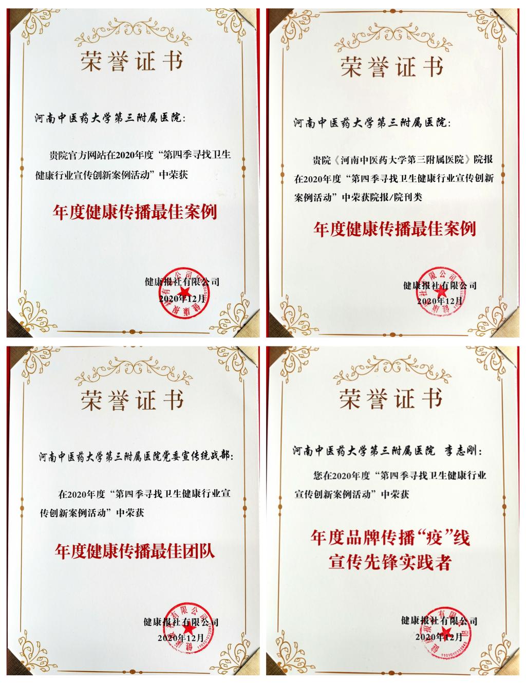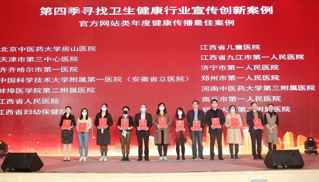 在“第四季寻找卫生健康行业宣传创新案例活动”颁奖仪式上,三附院报送的案例荣获4项殊荣,分别是2020年度“院刊院报类年度健康传播最佳案例”“官方网站类年度健康传播最佳案例”;党委宣传统战部荣获“年度健康传播最佳团队”、党委宣传统战部部长李志刚荣获“年度品牌传播‘疫’线宣传先锋实践者”。
