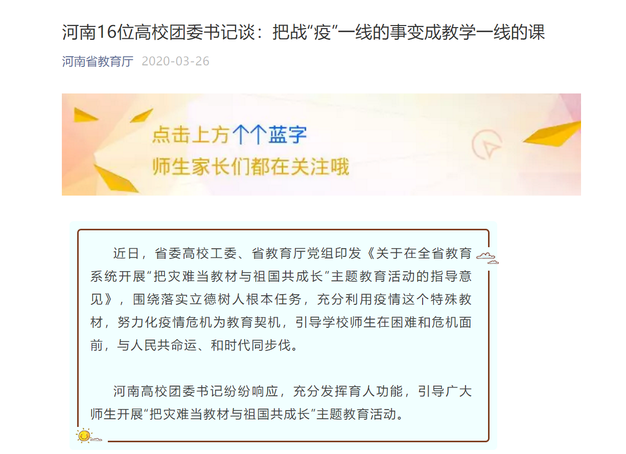 编者按:2020年3月25日,省教育厅官微对leyu·乐鱼(中国)体育官方网站团委书记高磊谈把战“疫”一线的事变成教学一线的课进行报道。现将部分文章刊发如下: