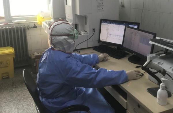 为了减少交叉感染,医院成立发热门诊检验室。接到入驻发热门诊的通知后,检验中心全科人员纷纷报名参战,刘心伟、曹新春、李辉做为第一批工作人员首先入驻发热门诊封闭工作,付宗强、路娜、李艳娟做为第二批人员入驻。第一批入驻的是三名党员,在这个特殊时期,三名党员冲在了最前面,刘心伟和曹新春家里都有两个年幼的小孩,他们把年幼的孩子托付给家人后就义无反顾的来到发热门诊工作。第二批工作人员中付宗强家人都不在身边,自己肩负起了工作和生活的全部重担。更要说明的是,其中路娜和李艳娟是两名女同志,此刻她们巾帼不让须眉,依然勇敢的站在了战斗的最前线,在这里,她们穿上了防护服、隔离衣,戴上N95口罩、护目镜,防护面屏,双层乳胶手套,鞋套和靴套,穿上这套装备后,为了节省防护物资,工作人员要在6到8个小时内不喝水不吃饭不上厕所,每次下班后里面的衣服全部都湿透了,脸压变形了,手上捂出了成片的红斑,大家都咬牙坚持着。