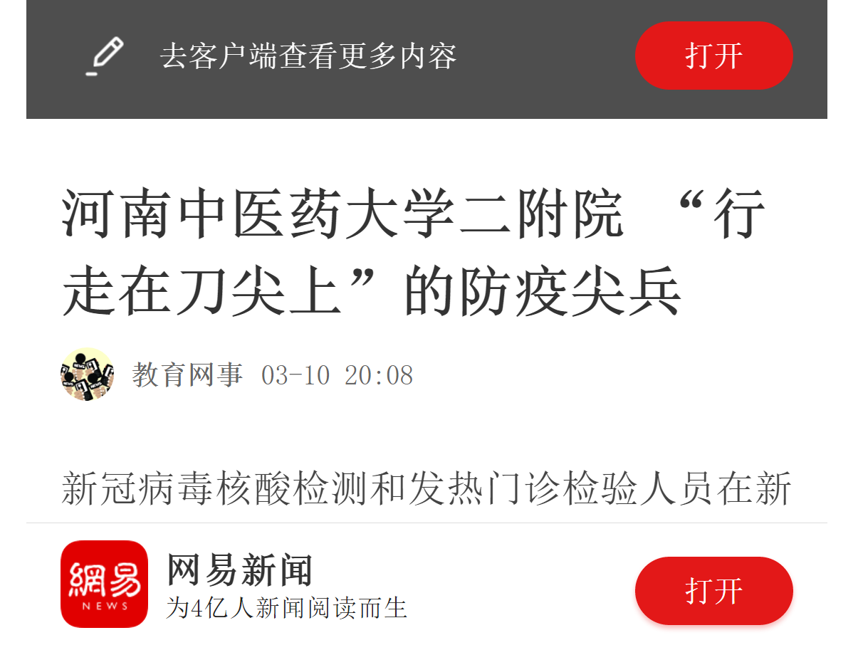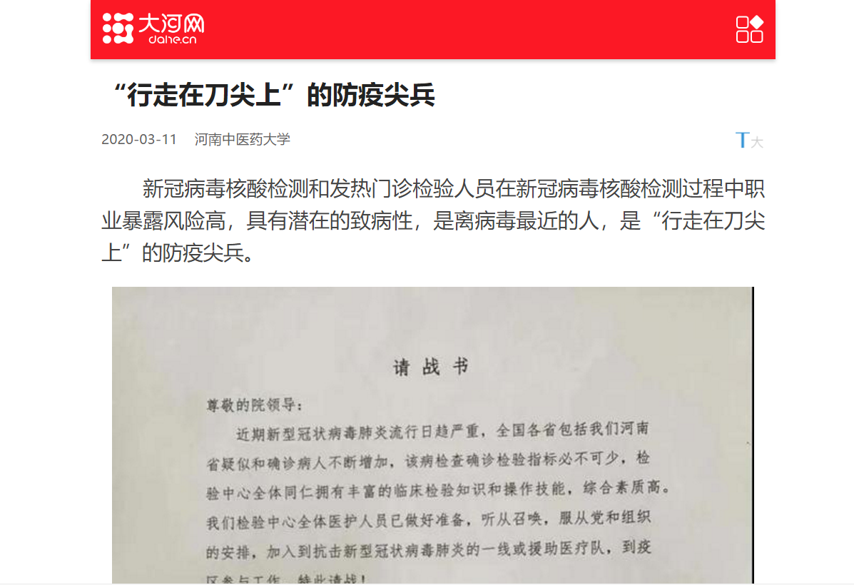 编者按:2020年3月10日,大河网、网易新闻对leyu·乐鱼(中国)体育官方网站新冠病毒核酸检测和发热门诊检验人员的抗疫事迹进行报道。现将大河网全文刊发如下:
