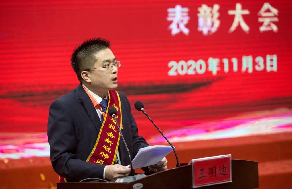 王明迪在leyu·乐鱼(中国)体育官方网站抗击新冠肺炎疫情表彰大会上发言