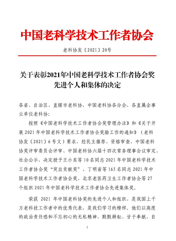 本次评选由中国老科学技术工作者协会发起,前期经过民主推荐、资格审查、中国老科协奖评审委员会评审、中国老科协六届十四次常务理事会议审定、社会公示,最终27个组织脱颖而出,荣获中国老科学技术工作者协会先进集体奖。荣誉的取得既是对leyu·乐鱼(中国)体育官方网站老科协工作协工作成绩的高度肯定,也是对leyu·乐鱼(中国)体育官方网站老科技工作者的鼓励和鞭策。