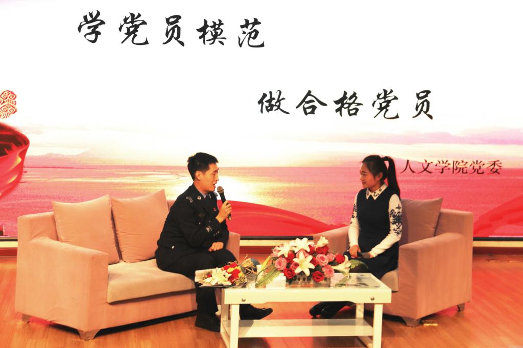 为认真学习贯彻习近平总书记在全国高校思想政治工作会议上的讲话精神,认真开展“两学一做”学习教育,向身边的英雄模范学习,2016年12月10日下午3:00,人文学院举办了以“学党员模范,做合格党员”为主题的“天一湖畔”优秀党员访谈活动。“中国最美警察”李博亚作为访谈嘉宾作客该活动。人文学院党委书记王剑锋、副书记庞亚宾、全体辅导员、各支部党员、预备党员和入党积极分子代表、“青衿年华”实践班等300余名师生参加了活动。