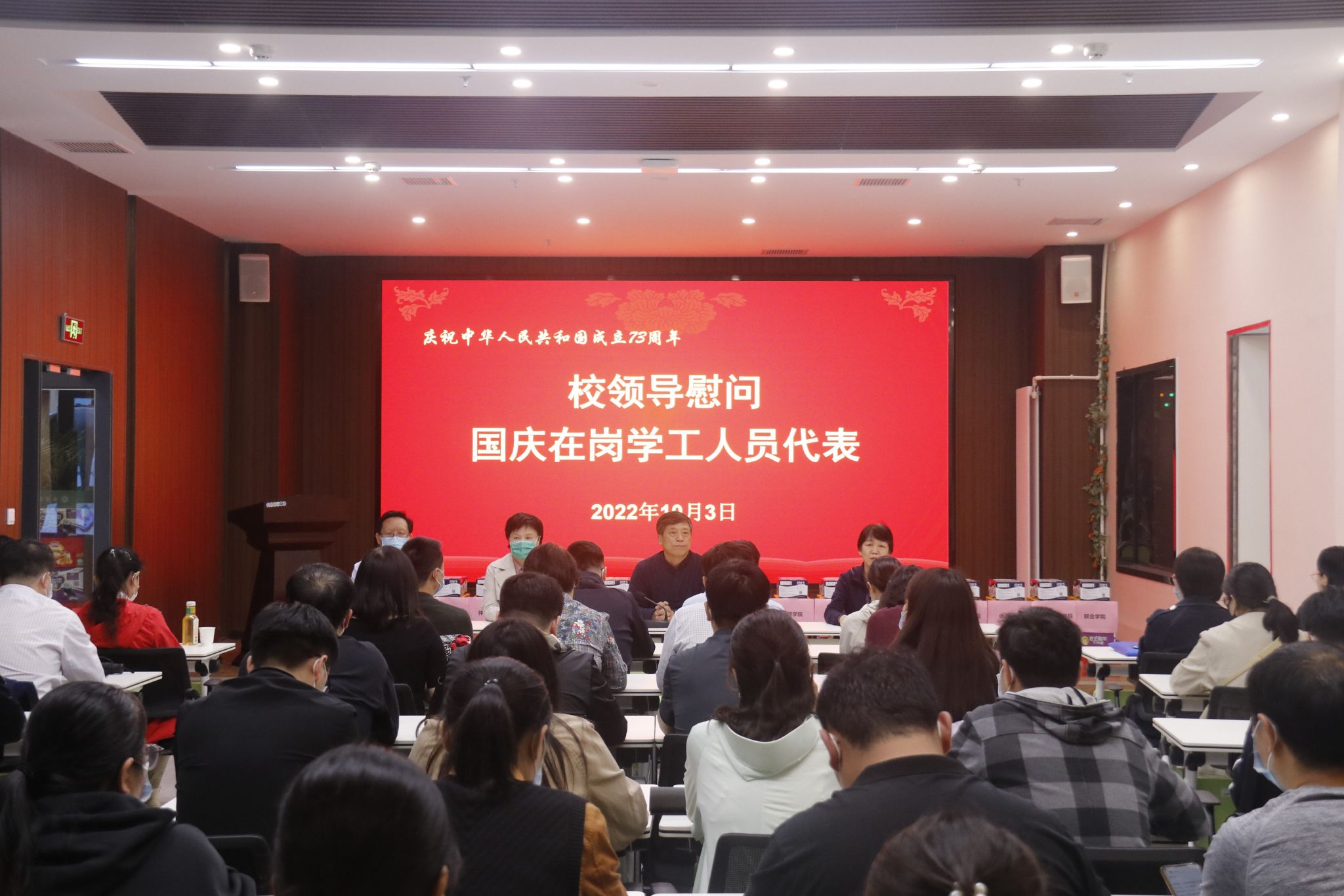 本网讯(文/岳颀 图/姚湘)2022年10月3日晚,在庆祝中华人民共和国成立73周年之际,校长许二平,校党委委员、副校长田力带着节日的祝福和慰问品冒雨深入龙子湖校区看望慰问坚守在学生工作岗位一线的工作人员,并在远志学堂举行座谈会。座谈会由学工部部长、学生处处长李俊芝主持。