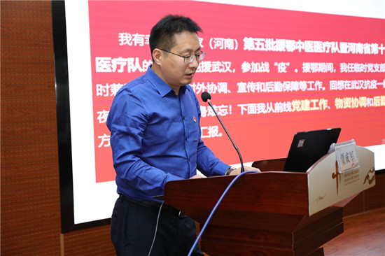 王海亮在总结讲话中指出,援鄂医疗队充分发挥中医药特色、克服困难医治病患,让党旗高高飘扬在抗疫一线,充分展现了医护人员临危不惧、大爱无疆的风采,以自己的实际行动践行了二附院人“承古纳今、厚德为民”的院训和“诚信·爱”的宗旨。他指出,坚持党中央的集中统一领导、把各级党组织的战斗堡垒作用和党员的先锋模范作用发挥出来,这是我们制度的最大优势,也是打赢疫情防控阻击战最有力的保障。他强调,全院要学习援鄂医疗队对党忠诚、听党指挥的政治品格,学习他们心系群众、人民至上的优秀品质,学习他们临危不惧、勇于奉献的责任担当,学习他们攻坚克难、敢打硬仗的优良作风,在各自的岗位上不忘初心、牢记使命,把抗疫的精神发扬光大,为医院和学校的转型发展贡献力量!