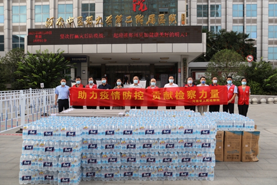 2021年8月9日下午,按照“四送一助力”文件精神,二附院的结对文明单位——河南省人民检察院派出党组成员、政治部主任姚福安,机关党委专职副书记王继锋,宣传处长刘立新,机关党办副主任胡新成,机关纪委副书记李达等一行8人,到医院开展“四送一助力”专项活动。河南省人民检察院向医院捐赠了矿泉水、帐篷、电风扇等抗疫物资,并对奋战在抗疫一线的医务工作者表示了慰问和致敬。医院党委书记王海亮,院长崔应麟,党委副书记、纪委书记王倩,副院长李涛、张勤生,工会主席李希民出席。