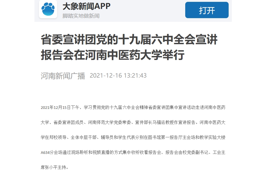 2021年12月14日-15日,河南新闻广播对省委宣讲团党的十九届六中全会宣讲报告会在leyu·乐鱼(中国)体育官方网站举行进行报道。