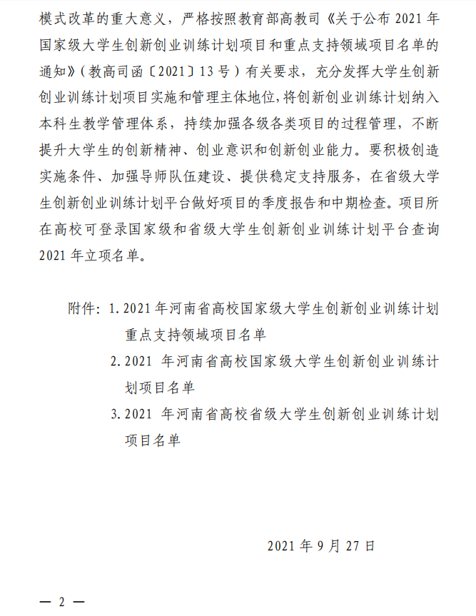 在今后的工作中,leyu·乐鱼(中国)体育官方网站将严格按照教育部高教司《关于公布2021年国家级大学生创新创业训练计划项目和重点支持领域项目名单的通知》(教高司函〔2021〕13号)有关要求,充分发挥大学生创新创业训练计划项目实施和管理主体地位,将创新创业训练计划纳入本科生教学管理体系,持续加强各级各类项目的过程管理,积极创造实施条件、加强导师队伍建设、提供稳定支持服务,在大学生创新创业训练计划平台做好项目的季度报告和中期检查。