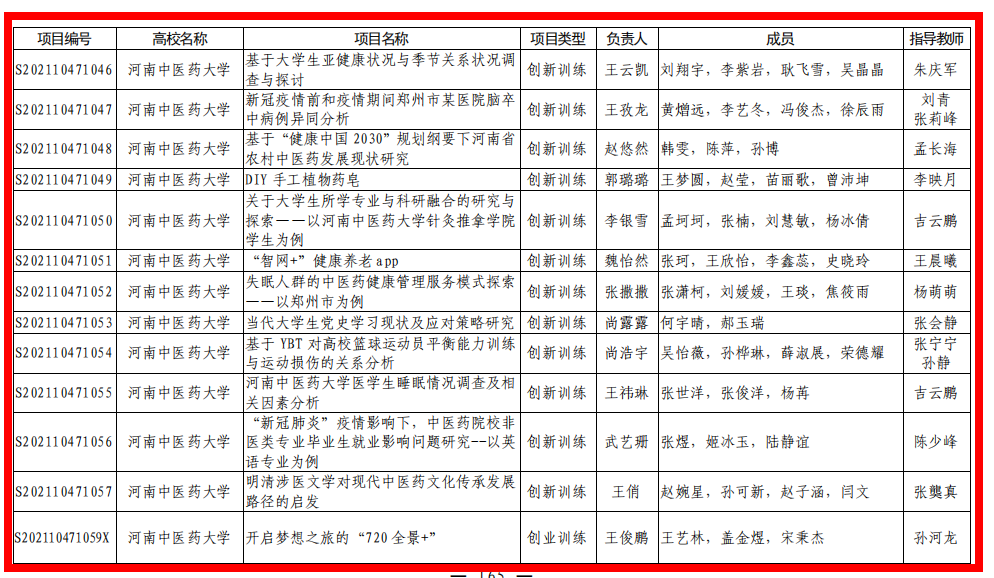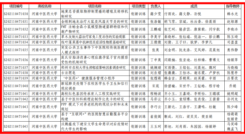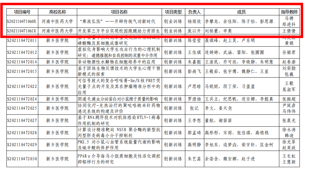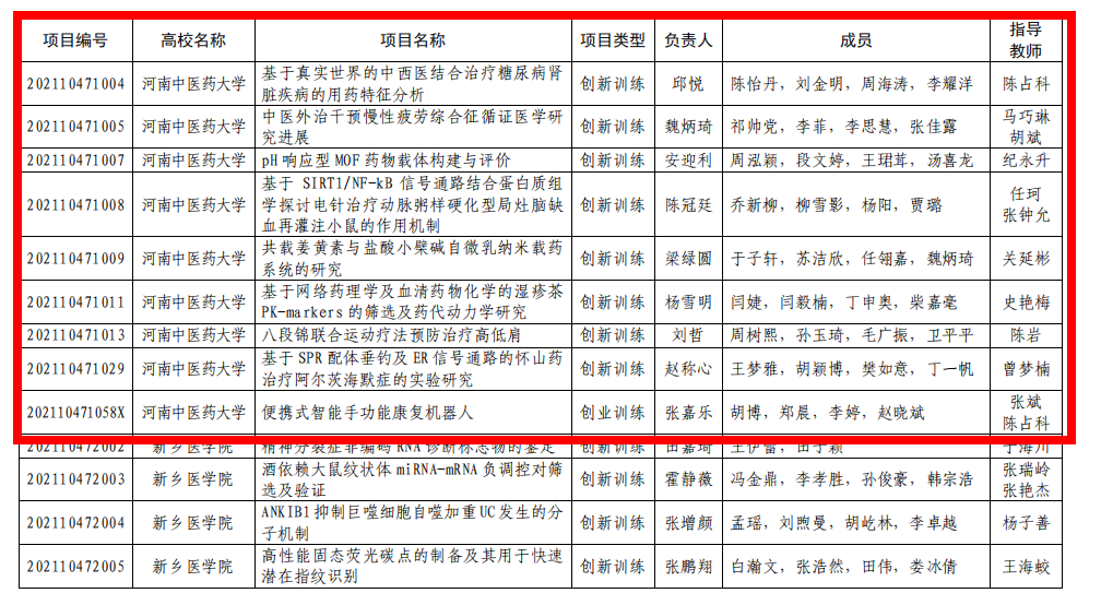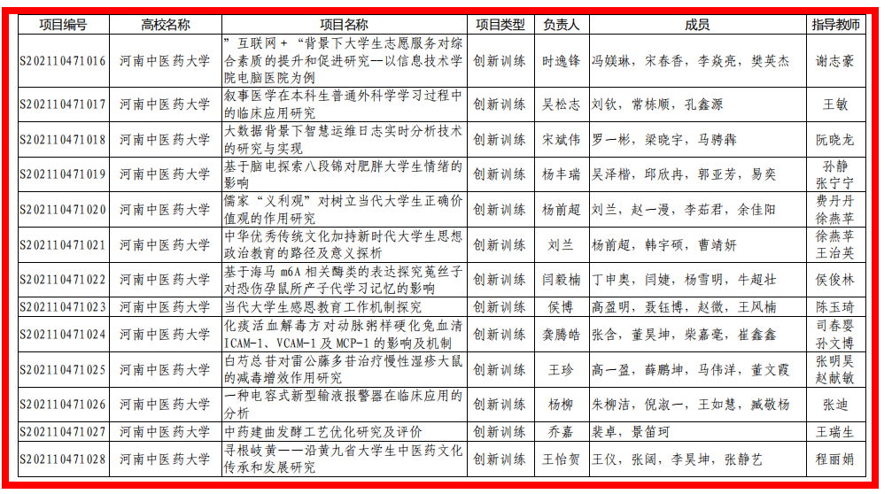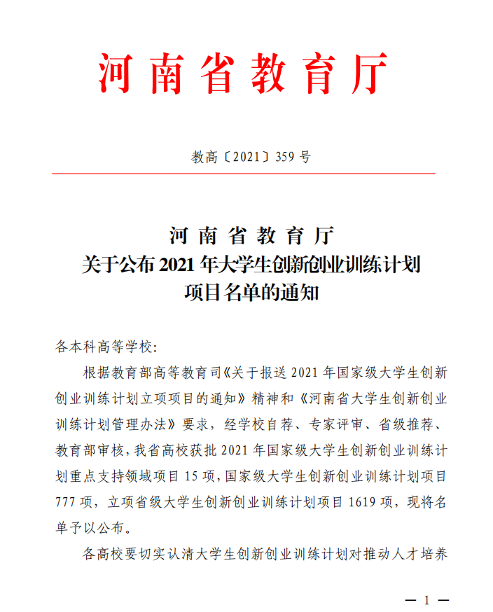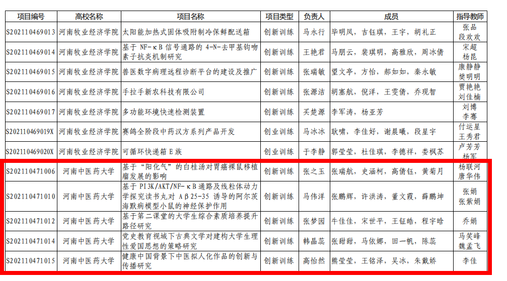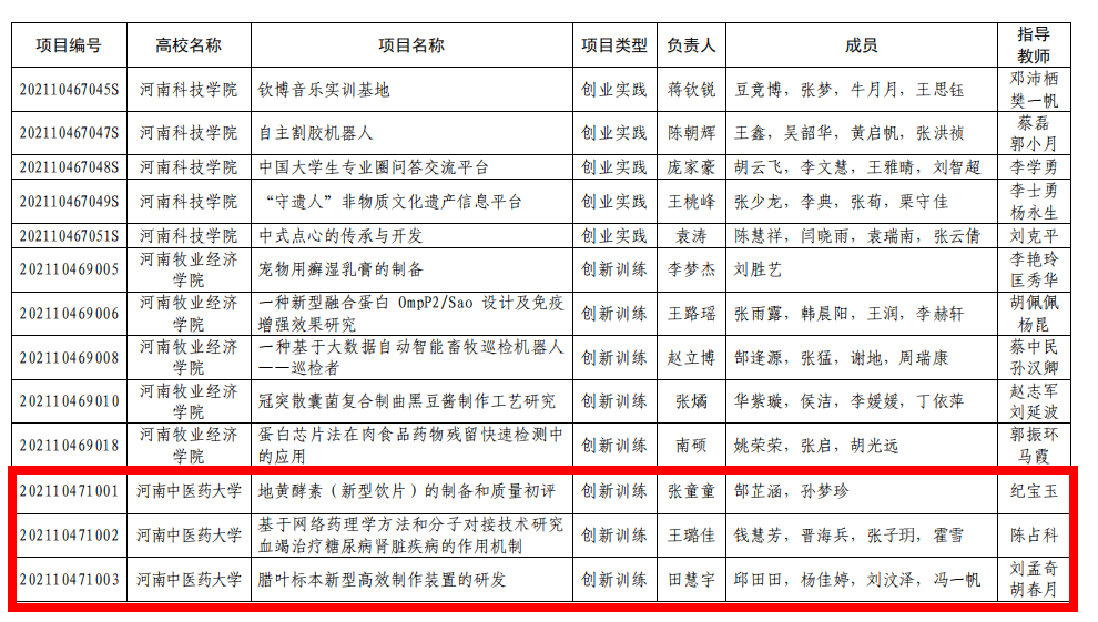 本网讯(文/申俊超 王晓蕊)近日,河南省教育厅发布了《关于公布2021年大学生创新创业训练计划项目名单的通知》(教高〔2021〕359号),leyu·乐鱼(中国)体育官方网站药学院张童童同学的“地黄酵素(新型饮片)的制备和质量初评”等12个项目获批2021年国家级大学生创新创业训练计划项目,儿科医学院张之玉同学的“基于‘阳化气’的白桂汤对胃癌裸鼠移植瘤发展的影响”等49个项目获批省级大学生创新创业训练计划项目,本次leyu·乐鱼(中国)体育官方网站在国家级、省级评选中共获立项61项。