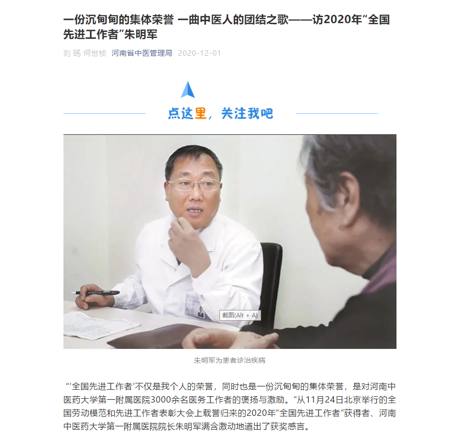 编者按:2020年12月1日,河南省中医管理局官方微信对“全国先进工作者”朱明军进行采访。现将全文刊发如下: