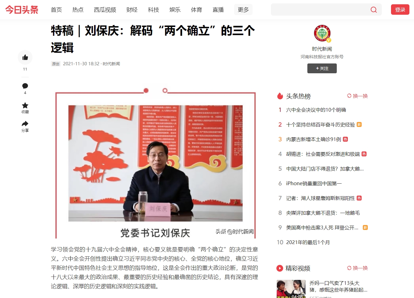 2021年11月30日,河南科技报强国号、时代新闻以《解码“两个确立”的三个逻辑》为题报道刘保庆同志的理论文章。