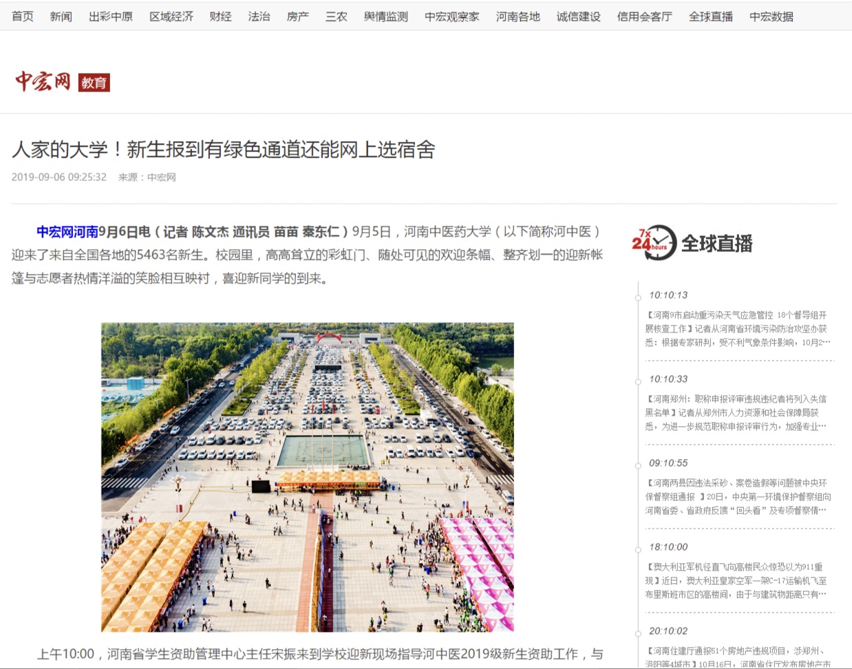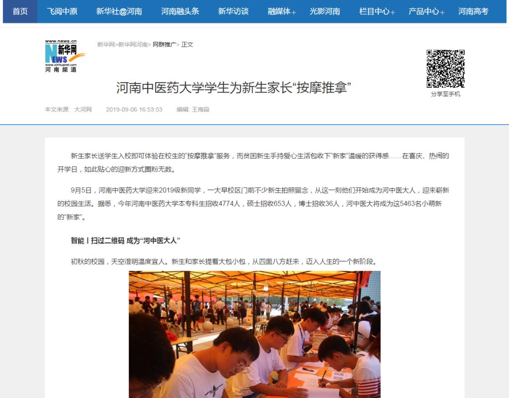 编者按:2019年9月5日,新华网、中宏网、大河网、新浪河南等多家媒体对leyu·乐鱼(中国)体育官方网站智能扫码登记、绿色通道、“爱心生活包”、按摩推拿体验等信息化“智能”迎新工作进行广泛报道,亮点频现、精彩纷呈。