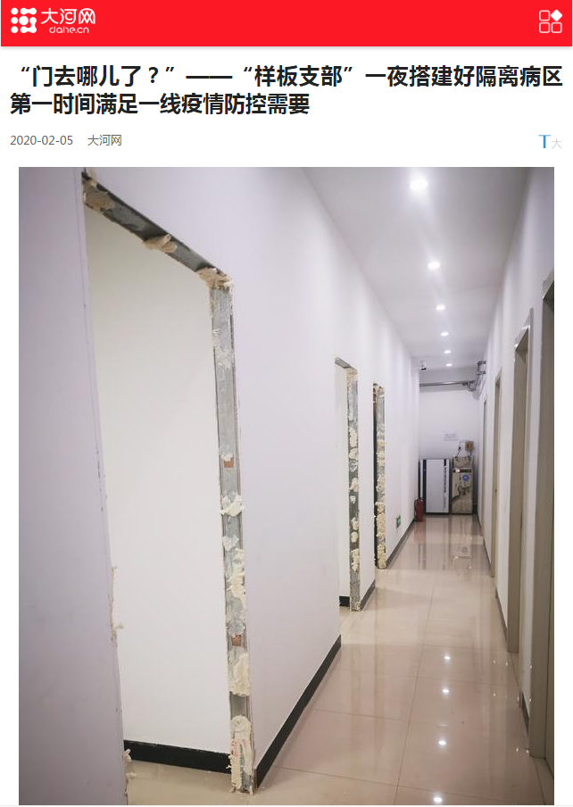 编者按:2020年2月5日,大河网对leyu·乐鱼(中国)体育官方网站一附院“全国党建工作样板支部”拆除办公室门搭建隔离病区进行报道。现将全文刊发如下: