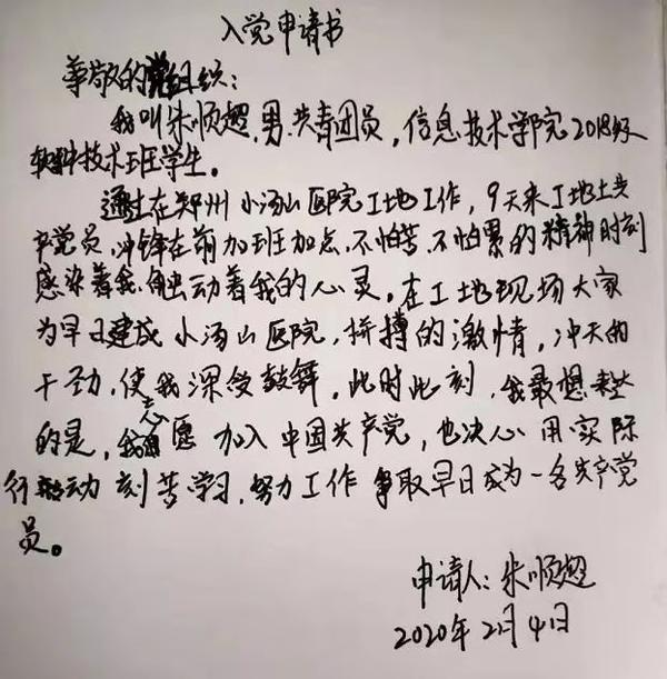 “敬爱的党组织,工地上共产党员冲锋在前,加班加点,不怕苦、不怕累的精神,时刻感染着我,工友们拼搏的激情、冲天的干劲时刻鼓舞着我,此时此刻,我最想表达的是,我志愿加入中国共产党”,朱顺超在工地现场向党组织递交了入党申请书。“武汉加油!河南加油!中国加油!”朱顺超说。