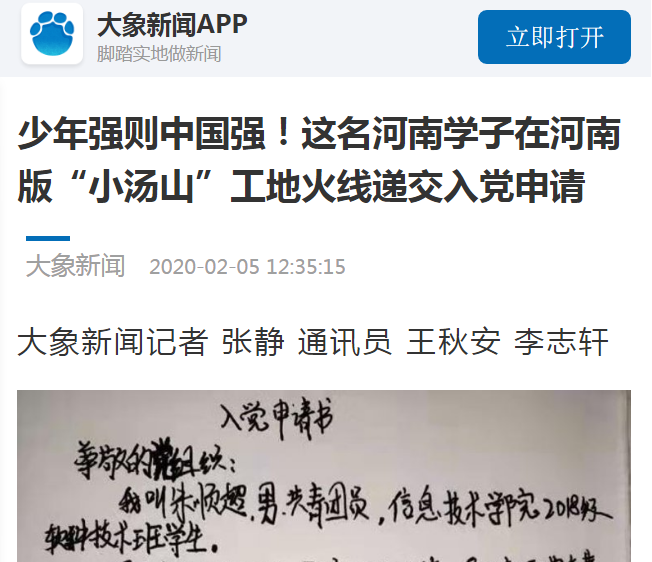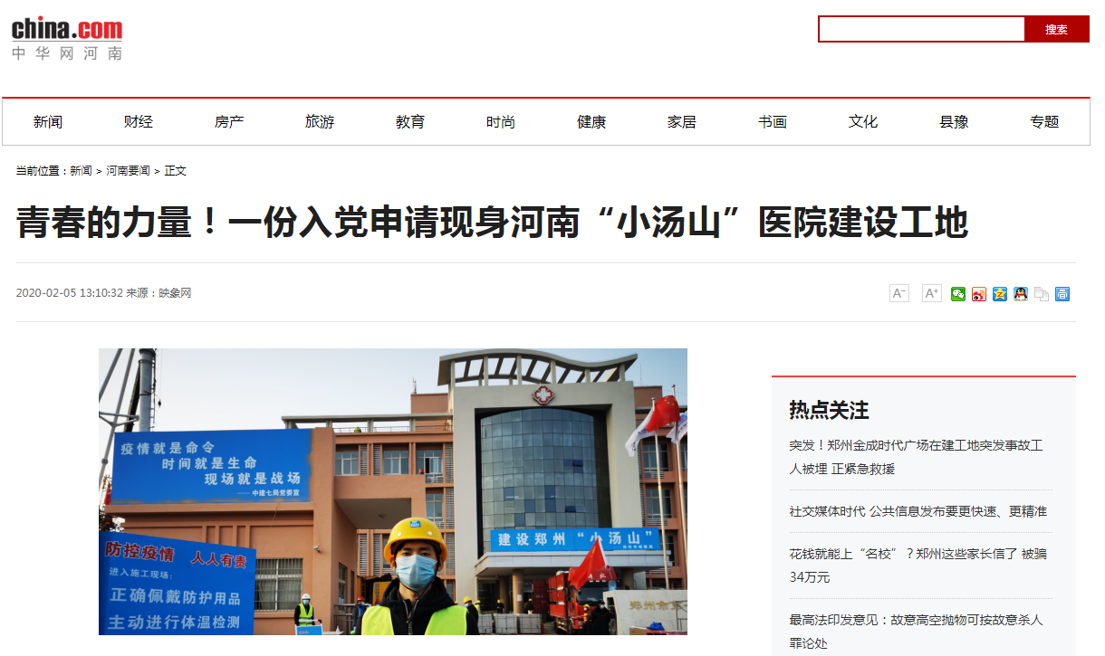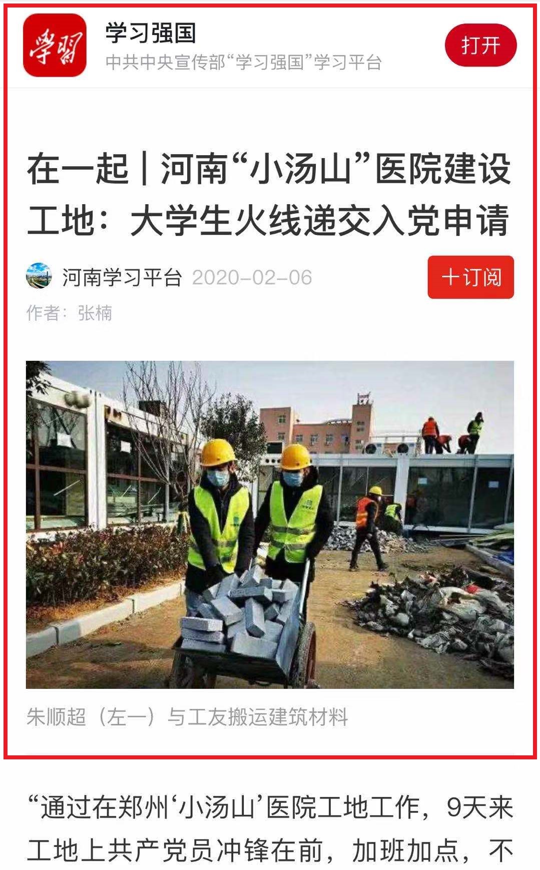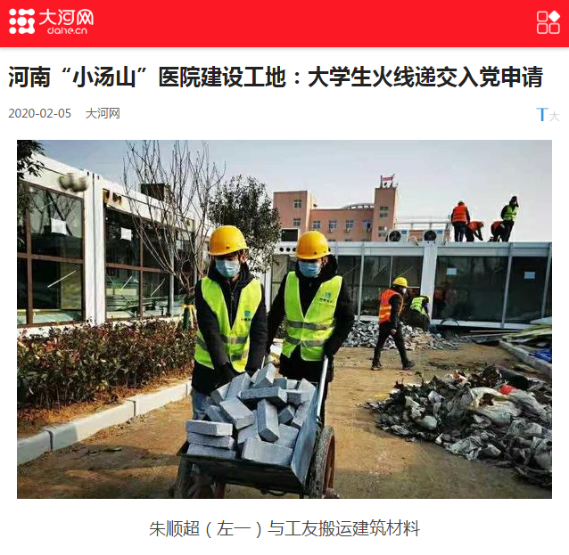 编者按:2020年2月5日-6日,学习强国、央广网、大河网、大河报网、河南卫视、中华网河南、大象新闻、猛犸新闻、河南经济广播、映象新闻、大公中原网等媒体对leyu·乐鱼(中国)体育官方网站学子朱顺超在河南“小汤山”医院建设工地递交入党申请进行广泛报道。现将大河网全文刊发如下: