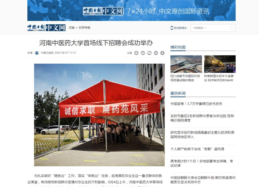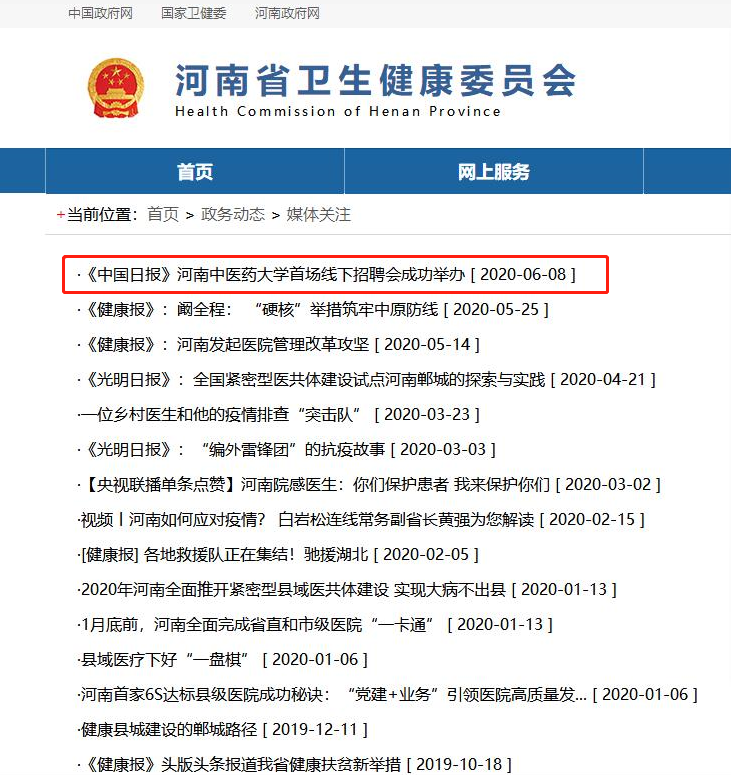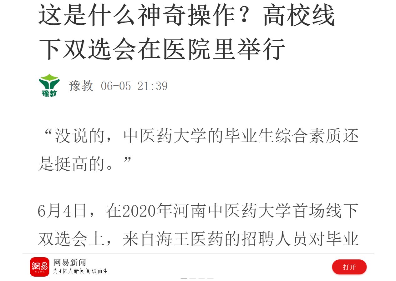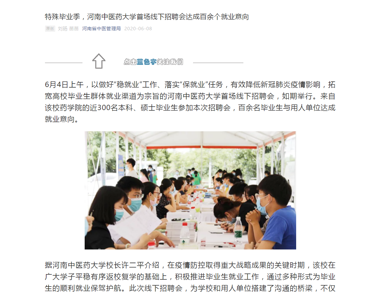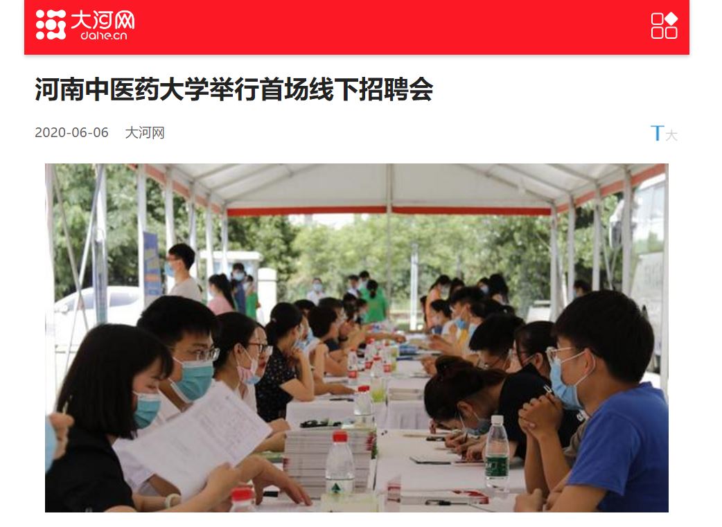 编者按:2020年6月5日-7日,中国日报网、省卫健委官网、河南省中医药管理局官微、大河网、网易新闻、今日头条等媒体对leyu·乐鱼(中国)体育官方网站首场线下招聘会成功举行进行报道。