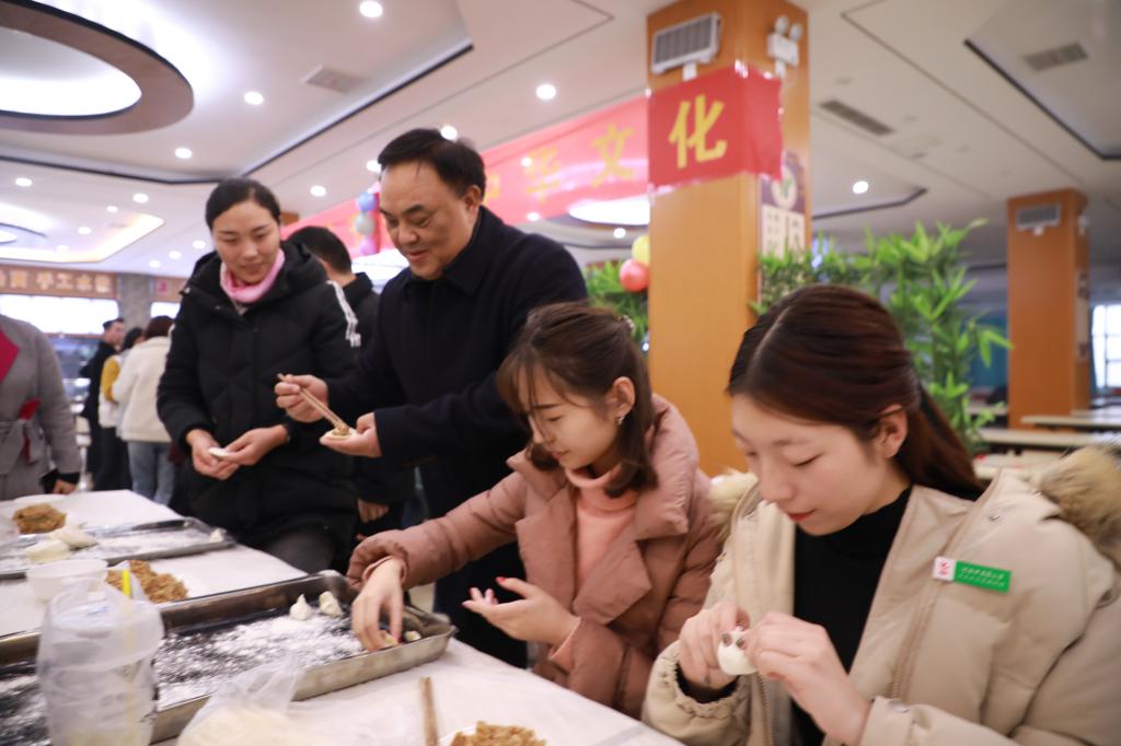 郭德欣在致辞中代表学校向全校师生致以节日问候,给大家讲解了冬至节日的由来和意义,让同学们更深入的了解传统文化的内涵。接着,后勤服务中心面点师傅手把手教同学们包饺子,讲解具体操作要领,让大家亲身体会到二十四节气传统文化的丰富内容与实践乐趣。饺子出锅后,白云平贫困生基金会的小云朵们为值守在学校保障服务一线的各宿舍楼的宿管老师、门卫、水暖电值班人员等送去爱心饺子,传递了冬日的温暖。现场师生有序领取并品尝饺子,窗外虽寒冷,屋内却是香气浮动,欢声笑语,暖意融融。