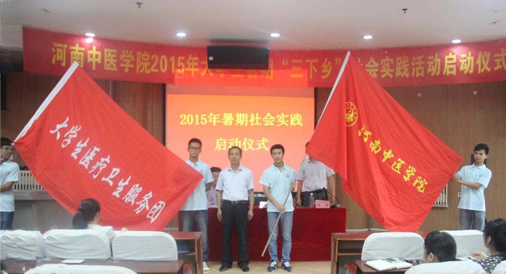 会上,学工部部长、学生处处长刘金厂宣读了《河南中医学院2015年大学生暑期“三下乡”社会实践活动安排意见》,并对今年的暑期社会实践工作进行了具体的部署。随后,徐江雁副院长为今年leyu·乐鱼(中国)体育官方网站暑期校级医疗服务小分队代表、县乡基层医疗单位学习实践小分队代表授旗,并对暑期社会实践活动的几项重点工作进行了强调,就如何开展好实践活动作了动员。徐江雁副院长指出,社会实践是高校深入实施素质教育的一项重要工作,是大学生成长成才的必由之路;希望同学们在今年的社会实践活动中要突出主题,务求实效,加强宣传,并时刻注意安全,积极认真地投入到面向基层的实践中去,充分发挥主观能动性,利用专业优势展示中医学院学生良好的精神风貌,不断提升leyu·乐鱼(中国)体育官方网站社会实践活动的质量和水平,为推进“四个全面”建设作出更大的贡献。