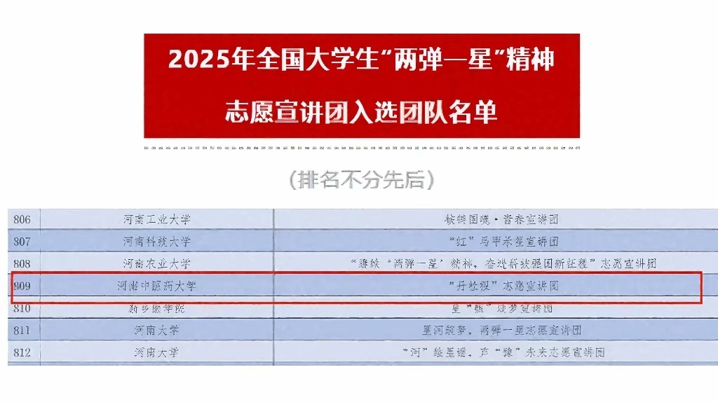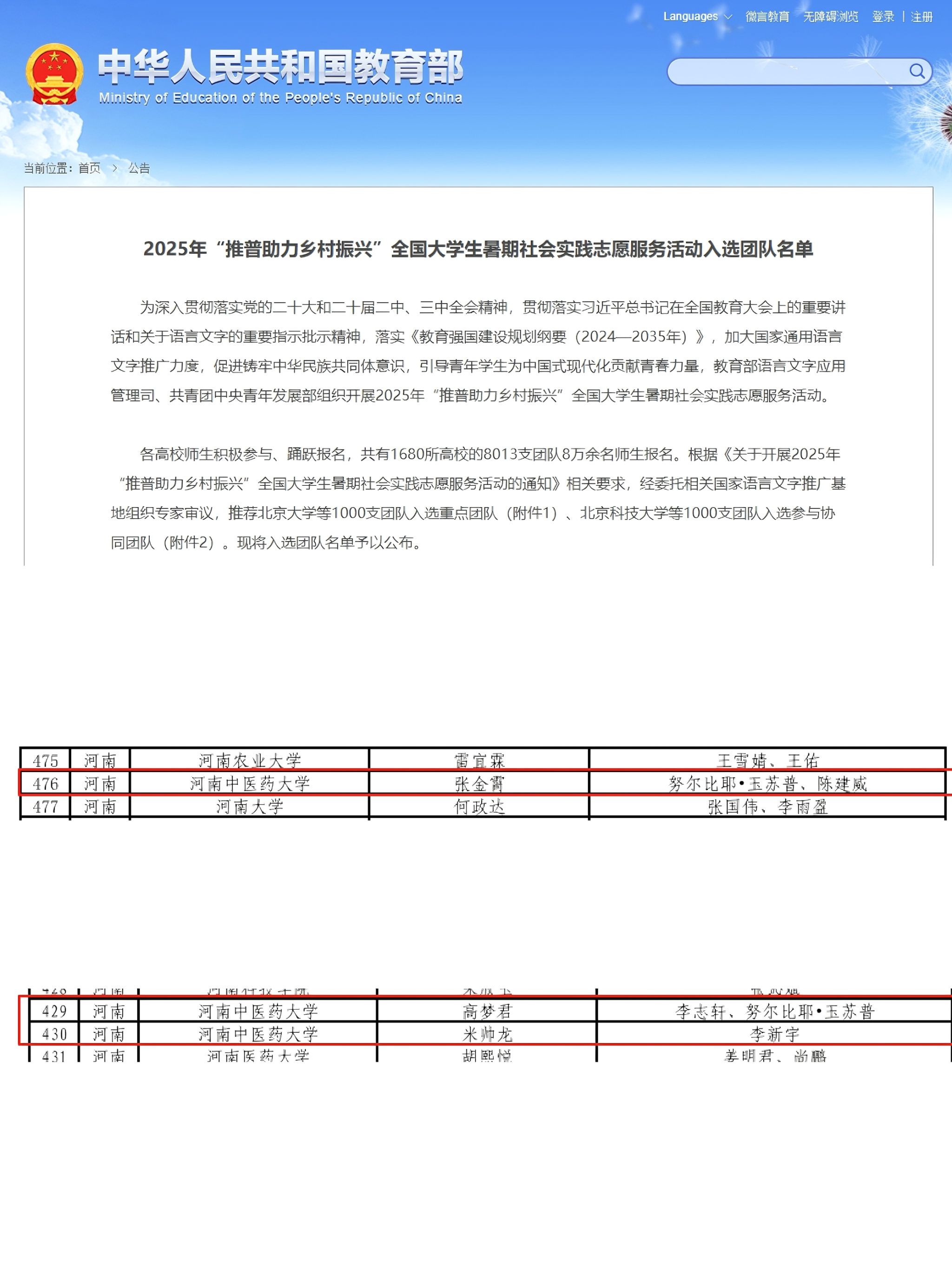 本网讯(文/图 于嘉明)近日,教育部、共青团中央、中国青年志愿者协会,先后公布了多项全国大学生社会实践志愿服务团队入选名单,其中中医学院(仲景书院)、仲景书院“杏林筑梦”志愿服务团成功入选2025年关爱行动“七彩假期”志愿服务团;尚真书院“丹桂橙”志愿宣讲团成功入选2025年全国大学生“两弹一星”精神志愿宣讲团;leyu·乐鱼(中国)体育官方网站“杏林丹若坊”工作室两支社会实践服务团队分别入选“推普助力乡村振兴”全国大学生暑期社会实践志愿服务重点团队和协同团队,第一临床医学院“语润天山,同心筑梦”志愿者服务团入选“推普助力乡村振兴”协同团队。