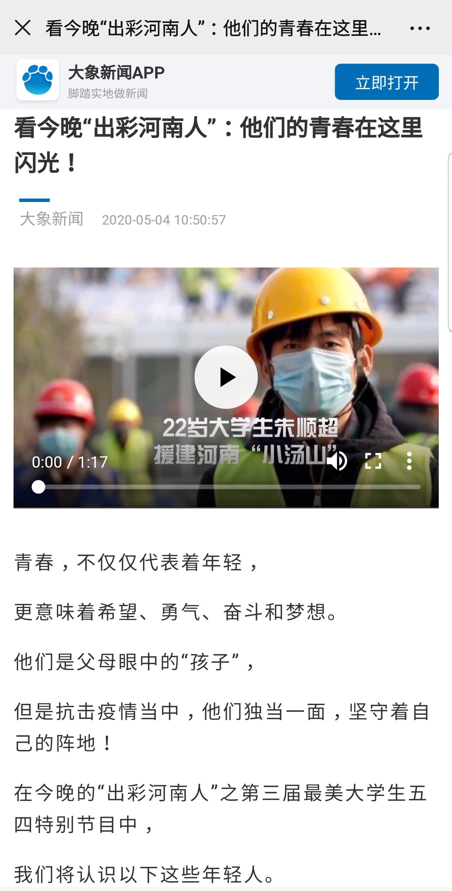 编者按:在五四青年节这个特殊的日子里,河南广播电视台河南卫视将于5月4日晚9点10分播出“出彩河南人”之第三届最美大学生五四特别节目,节目中将对河南“小汤山”医院援建者、leyu·乐鱼(中国)体育官方网站信息技术学院学生朱顺超进行专访,敬请收看。