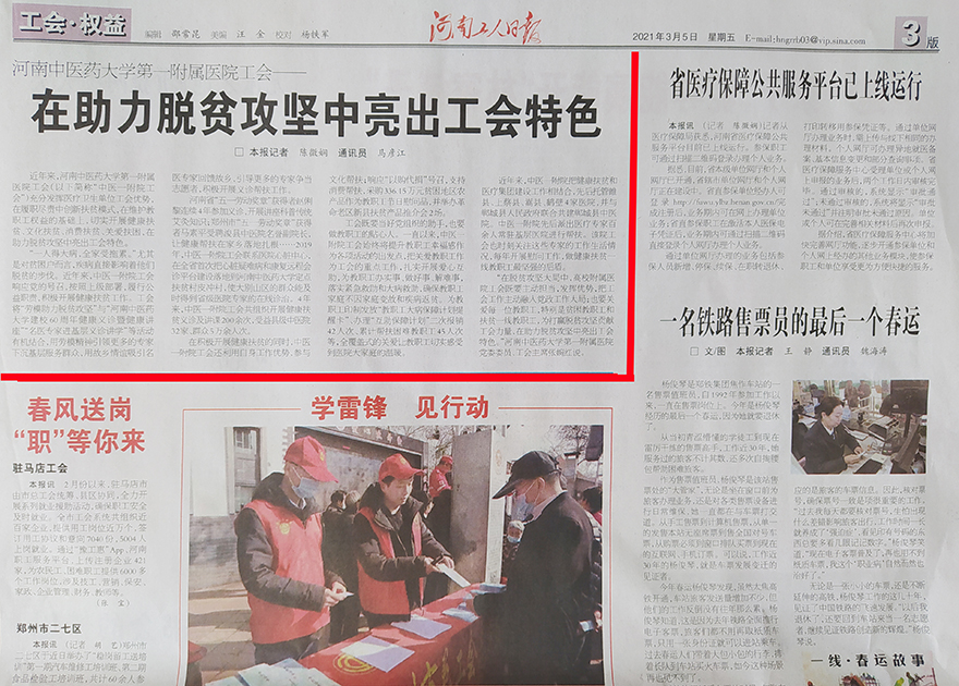 编者按:2021年3月5日,《河南工人日报》以“在助力脱贫攻坚中亮出工会特色 ”为题,报道了一附院工会在助力脱贫攻坚方面的特色与成绩。现全文刊发如下:
