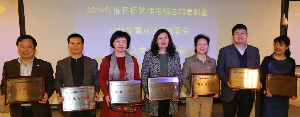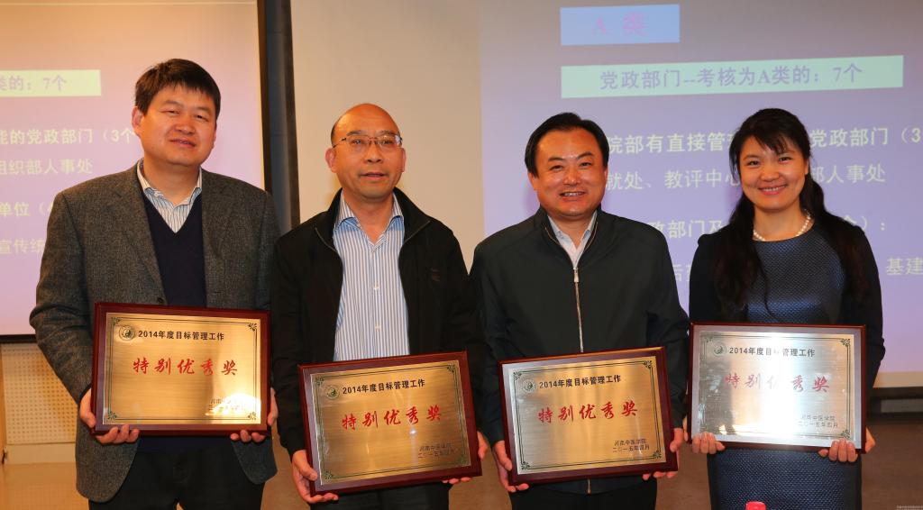 副院长郭德欣从2014年度目标管理考核工作回顾、目标管理考核评议结果、目标管理考核奖励办法等三个方面进行了简要总结,宣布了2014年度目标管理考核评议结果及奖励办法。之后,校领导分别为获奖部门和单位颁发奖牌。今年的表彰特别增设了特别优秀奖,连续三年以上获得目标考核A类优秀奖、并在今年考核中继续保持A类成绩的方可获得,学校党委院长办公室、教务处、药学院、人文学院等收获了首届特别优秀奖殊荣。获得A类优秀奖的部门和单位有基础医学院、第二临床医学院、信息技术学院、国际教育学院、离退休职工工作处、教评中心、招生就业处、组织部人事处、后勤集团公司、宣传统战部、基建处等11个院部和部门。在今年的考核中,为进一步激发大家干事创业的激情,对考核名次进步较快、与上年度相比递进三个位次以上的部门新增了快速进步奖,学生处、审计处、保卫处、图书馆、国资处等部门获此奖项;去年学校有专业认证、国家级教学成果奖突破、中医药院校传统体育比赛、三甲医院创建等大事喜事,基础医学院、第三附属医院、体育教研部、第二临床医学院、离退休职工工作处、教评中心、党委院长办公室、教务处等单位和部门作出了突出成绩,获得年度突出贡献奖。大会还为获得创新奖的部门和单位颁发了证书。