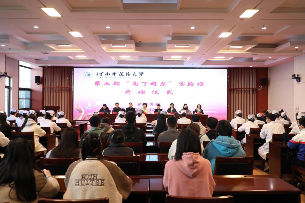 本网讯(文/和青森 图/李林峰)2021年12月14日,护理学院在图书馆第二报告厅举办第七期“南丁格尔”实验班开班仪式,校党委委员、副校长田力,第45届南丁格尔奖章获得者、柘城县人民医院护理部主任宋静、教务处处长禄保平、校团委副书记黄怡博、护理学院党政班子、第七期“南丁格尔”实验班学员及师生代表70余人参加开班仪式,护理学院党委副书记马慧玲主持活动。