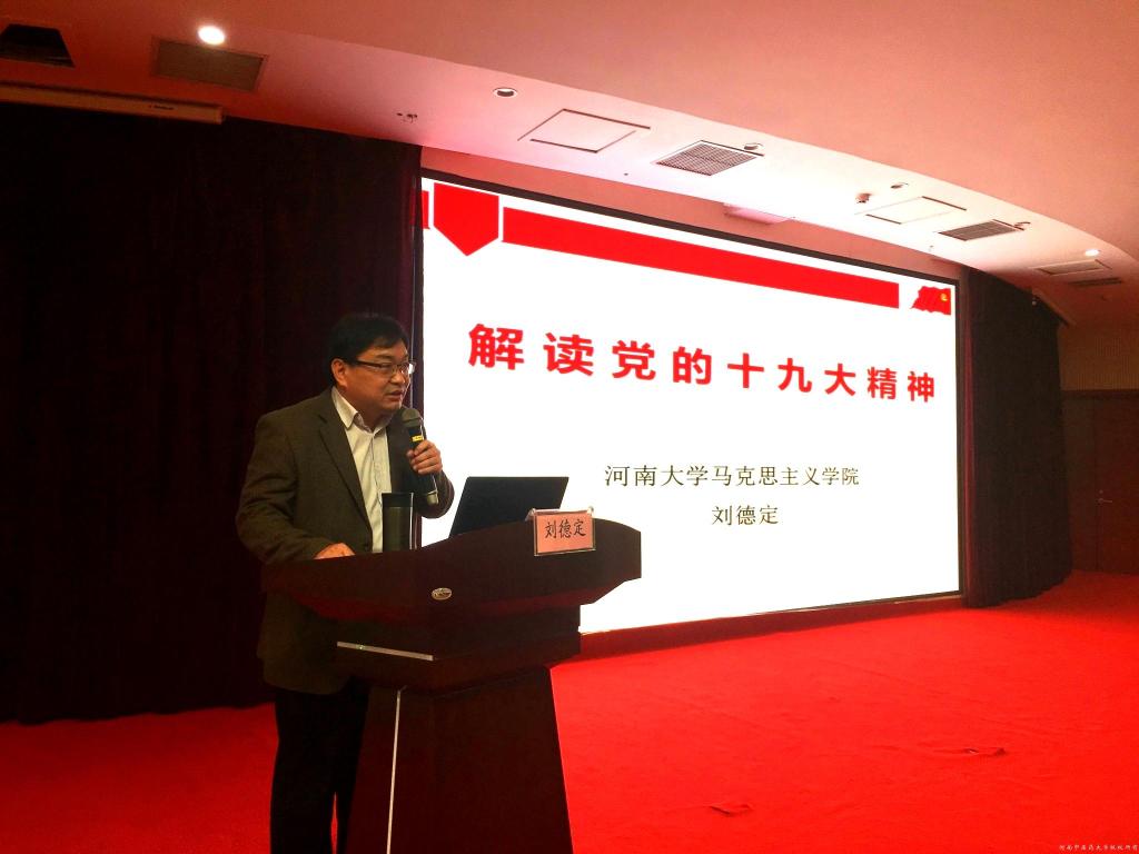 刘德定教授从十九大主题和主要成果、过去五年基本总结和我国发展新的历史方位、 新时代中国共产党的历史使命、新时代中国特色社会主义思想和基本方略、决胜全面建成小康社会、开启全面建设社会主义现代化国家新征程、五大建设的主要任务、坚定不移全面从严治党、不断提高党的执政能力和领导水平七个方面对十九大报告进行了精彩纷呈的解读。