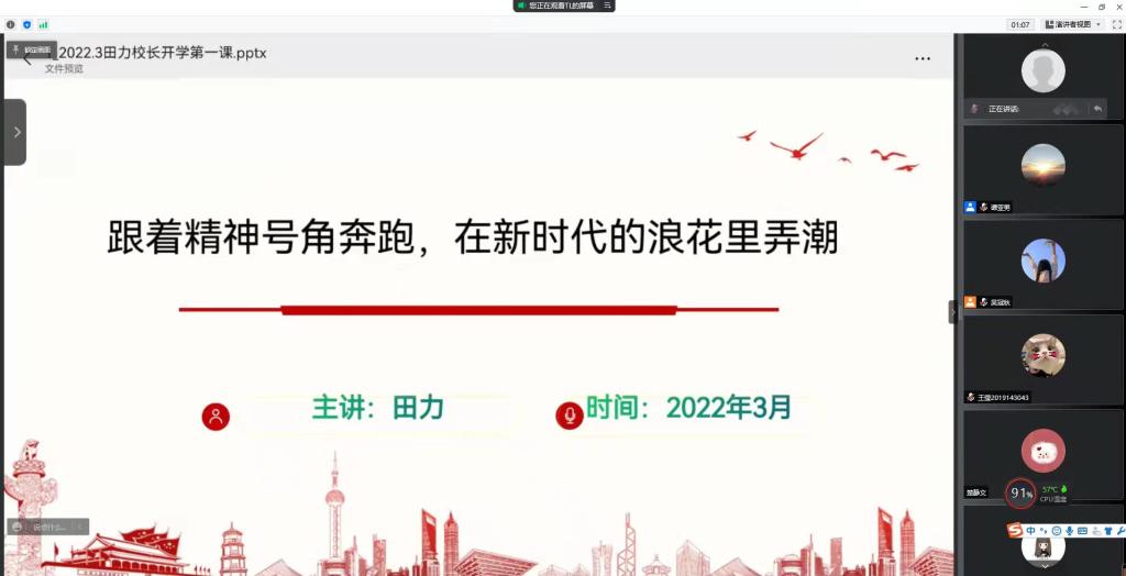 本网讯(文/王艺沛 谭亚男 图/王艺沛)为深入贯彻习近平总书记关于“大思政课”的重要指示精神,落实立德树人根本任务,为党育人、为国育才。2022年3月17日下午,校党委委员、副校长田力以线上直播的形式为护理学院学生上春季学期开学思政第一课。学院党委副书记马慧玲主持学习活动。