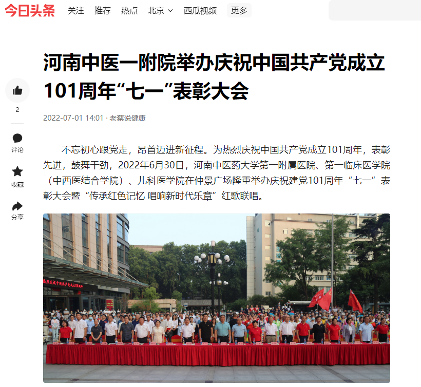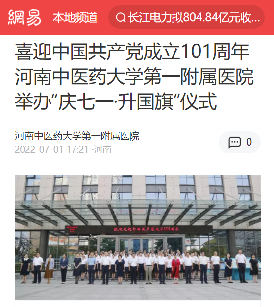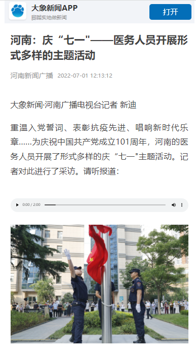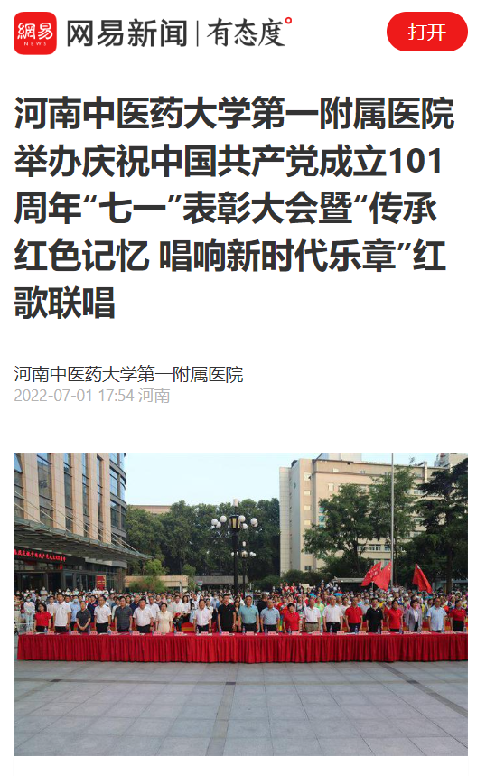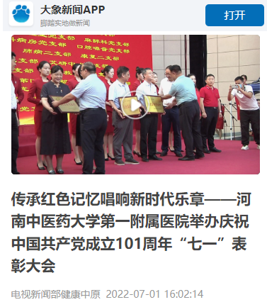 2022年7月1日,河南日报客户端、大象新闻、网易新闻、今日头条、健康中原等多家媒体对一附院开展庆“七一”主题活动进行报道。
