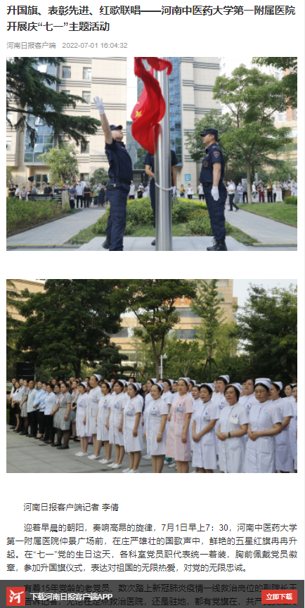 河南日报等丨升国旗、表彰先进、红歌联唱——leyu·乐鱼(中国)体育官方网站第一附属医院开展庆“七一”主题活动