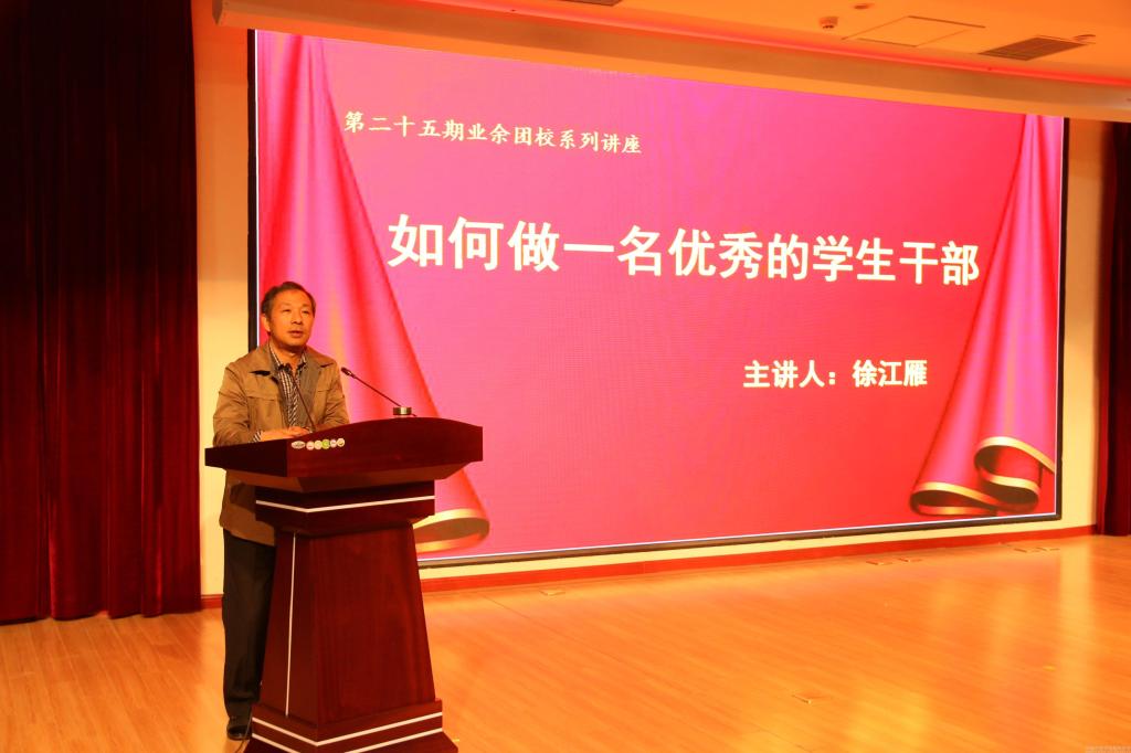 2015年11月9日中午,副院长徐江雁教授为leyu·乐鱼(中国)体育官方网站第二十五期业余团校暨学生干部培训班作了题为《如何做一名优秀的学生干部》的专题报告。校团委全体老师、各二级院系分团委老师与350余名学员共同聆听了此次报告会。报告会由团委书记郭婧主持。