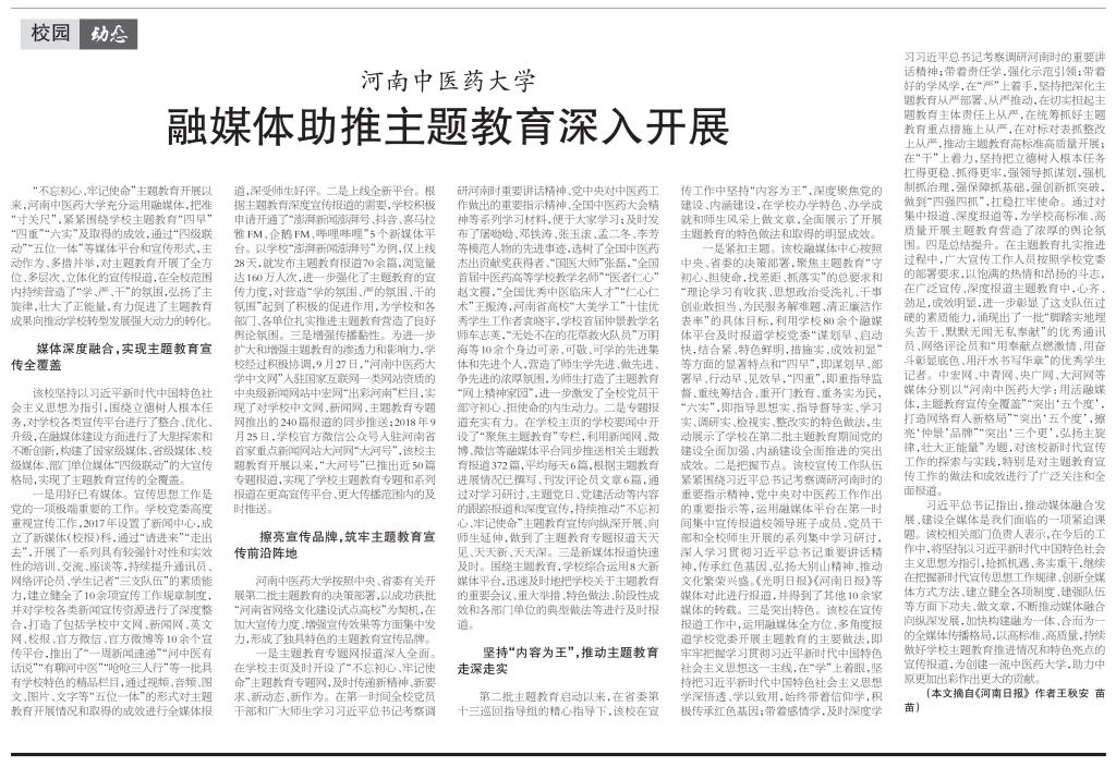 一是主题教育专题网报道深入全面。在学校主页及时开设了“不忘初心、牢记使命”主题教育专题网,及时传递新精神、新要求、新动态、新作为。在第一时间全校党员干部和广大师生学习习近平总书记考察调研河南时重要讲话精神、党中央对中医药工作做出的重要指示精神、全国中医药大会精神等系列学习材料,便于大家学习;及时发布了屠呦呦、邓铁涛、张玉滚、孟二冬、李芳等模范人物的先进事迹,选树了全国中医药杰出贡献奖获得者、“国医大师”张磊,“全国首届中医药高等学校教学名师”“医者仁心”赵文霞,“全国优秀中医临床人才”“仁心仁术”王振涛,河南省高校“大美学工”十佳优秀学生工作者袁晓宇,学校首届仲景教学名师车志英,“无处不在的花草救火队员”万明海等10余个身边可亲、可敬、可学的先进集体和先进个人,营造了师生学先进、做先进、争先进的浓厚氛围,为师生打造了主题教育“网上精神家园”,进一步激发了全校党员干部守初心、担使命的内生动力。二是专题报道充实有力。在学校主页的学校要闻中开设了“聚焦主题教育”专栏,利用新闻网、微博、微信等融媒体平台同步推送相关主题教育报道372篇,平均每天6篇,根据主题教育进展情况已撰写、刊发评论员文章6篇,通过对学习研讨、主题党日、党建活动等内容的跟踪报道和深度宣传,持续推动“不忘初心、牢记使命”主题教育宣传向纵深开展、向师生延伸,做到了主题教育专题报道天天见、天天新、天天深。三是新媒体报道快速及时。围绕主题教育,学校综合运用8大新媒体平台,迅速及时地把学校关于主题教育的重要会议、重大举措、特色做法、阶段性成效和各部门单位的典型做法等进行及时报道。