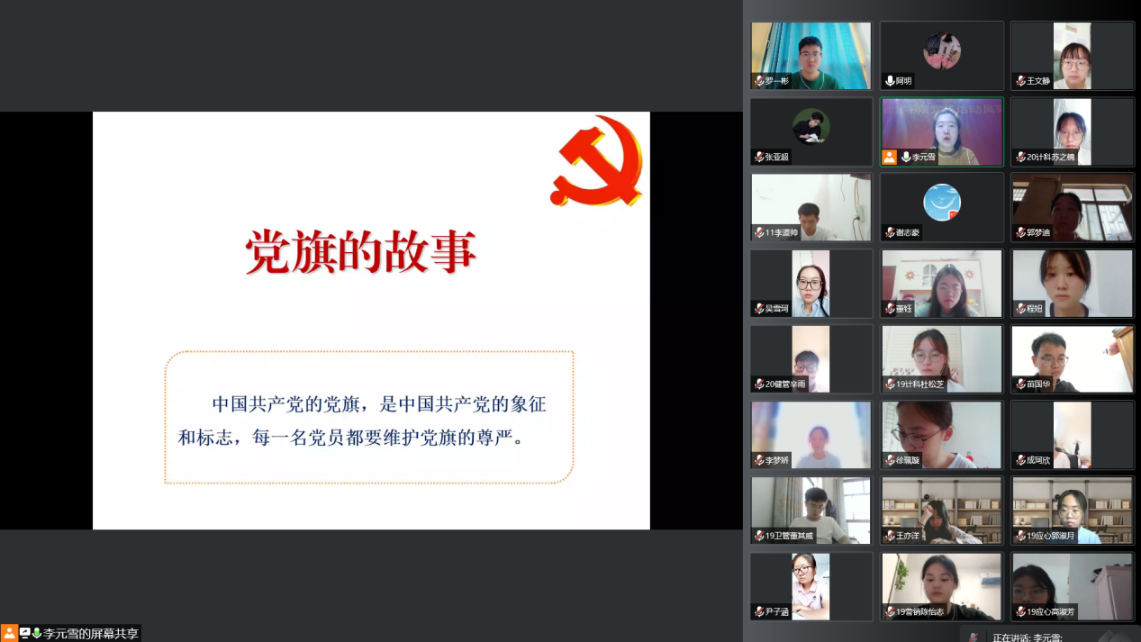 2021级学生第一党支部书记李元雪老师给全体党员上了专题党课《党旗的故事》,详细讲述了党旗的历史、演变过程、象征含义、使用场合等,给大家普及了党旗的知识,为大家进行了一堂深刻的党性教育。