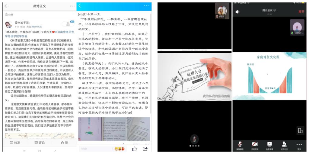 外语学院充分利用新媒体平台,创新性开展学生心理健康教育工作。疫情期间,外语学院在学院公众号外语微视角开设“心理小贴士”、“心语微言”特色板块,定期给同学们推送心理知识与疏导方法,开设“心委time”板块,宣传各班心理委员在疫情期间的的工作经验和方法,促进心理委员工作经验交流。为培养同学们的自我管理能力,丰富宅家活动,开展了“战疫情”打卡活动和“时不我待,书香永存”七天读书打卡分享活动,通过假期学习、生活习惯、日常兴趣三个方面的微博打卡,展现外语学院学子乐观的生活态度和积极向上的精神风貌。为激发同学们的家国情怀和人文关怀,举办了“以笔战疫”主题征文活动,通过向奋斗在疫情一线的英雄们致敬,让同学们做生活中的“有心人”。此外,把疫情危机化为教育契机,开展了“吐槽大会——我和家人的那些事儿”心理主题班会,鼓励同学们正确看待与家人之间的冲突,学会换位思考,构建和谐家庭氛围。