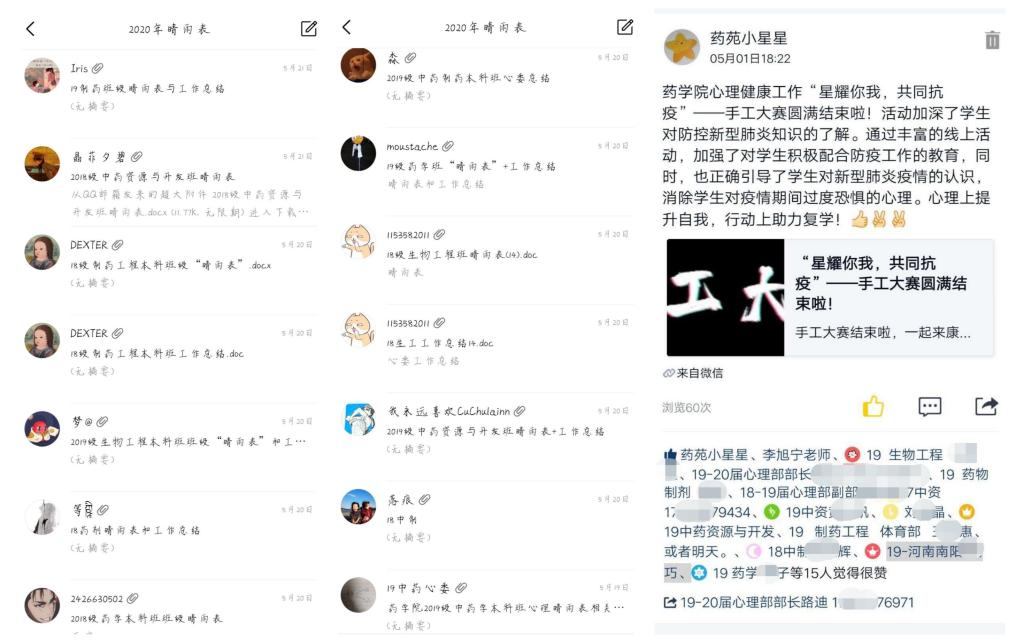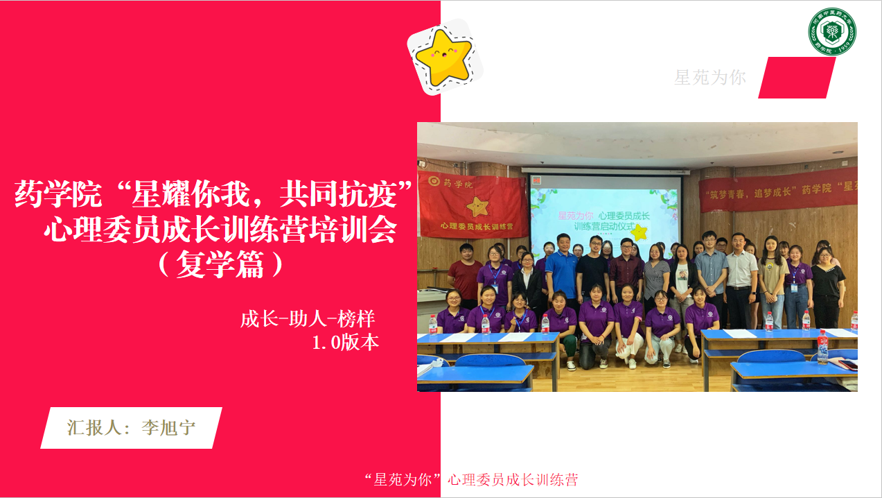 药学院心理辅导站以“星苑为你”心理委员成长训练营为抓手,以班级为单位,积极利用云班会、微信群、QQ群、心理部官方QQ“药苑小星星”等宣传平台,定期给同学们推送温馨励志话语、心理小知识和心理小贴士等,多渠道、多角度及时全面地向学生宣传普及心理健康知识;实施“班级晴雨表”制度,保证辅导员每周与班级同学的联络;以“星耀你我 同心抗疫”为主题举行了一系列心理健康活动,如心理健康专题培训、心理健康及复学主题班会、宿舍手工艺品大赛等活动,以线上线下相结合的方式丰富拓展学生们的课余生活;加强对心理委员、心理部成员和宿舍信息员的指导与培训,增强工作的责任感和参与感,充分发挥朋辈心理服务队伍在心理健康教育工作网络体系中的基础性作用,为药学院心理健康工作做实做细,打下了坚实的基础。
