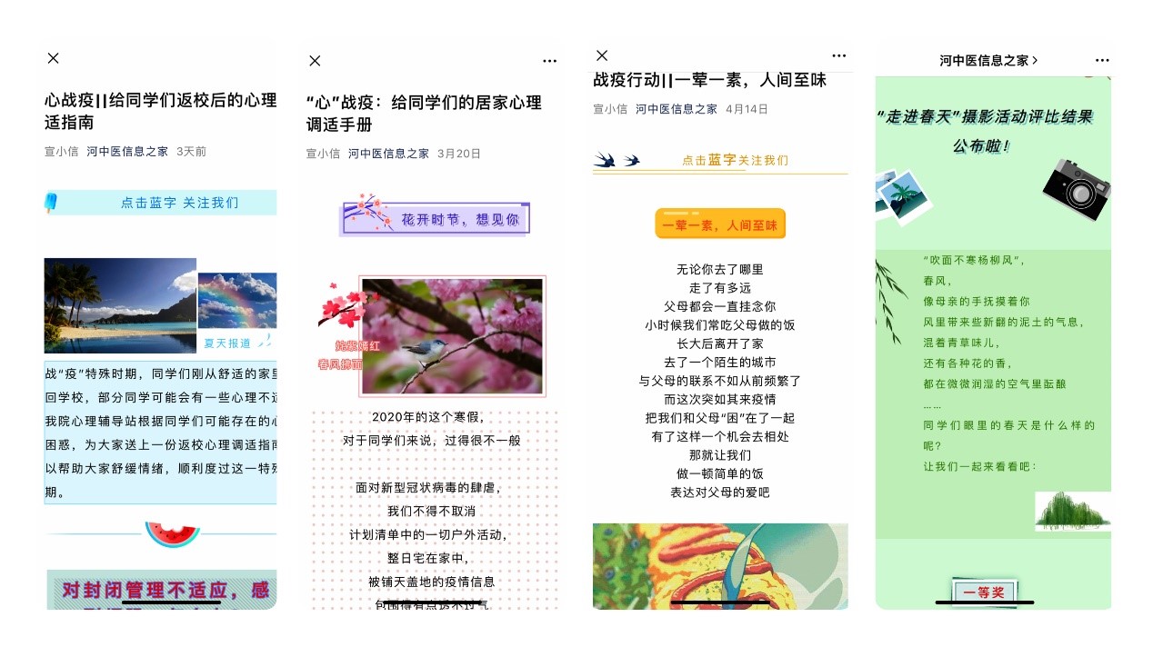 为缓解疫情下同学们的不良情绪,信息技术学院积极开展心理疏导工作,辅导员老师定期通过电话、微信等方式与学生本人和学生家长沟通交流,对于因疫情造成就业困扰的毕业生群体,辅导员老师与学生一起谋出路、想办法、出主意,帮助学生切实解决实际问题。为提高同学们的心理自助能力,利用网络平台和公益微课资源,对学院心理委员和心理健康信息员进行培训,通过“河中医信息之家”微信公众号定期推送疫情期间大学生心理自我调节的有关知识,面向全院学生举办了“一荤一素,人间至味”、“停课不停练,运动战疫情”、“走进春天”摄影比赛等心理抗疫系列活动,增强同学们的心理抗疫知识,多角度展现抗疫必胜的信心。