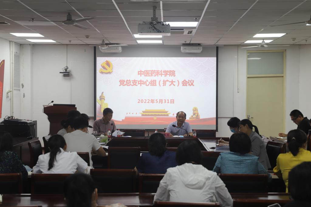 本网讯(文/张明远 图/谷康)为深入贯彻学习习近平总书记关于科技创新的重要论述,深化“能力作风建设年”活动成效,进一步激励全院科研工作者坚定理想信念,凝聚科研奋进新力量,2022年5月31日下午,中医药科学院召开党总支中心组扩大会议,邀请校党委委员、副校长苗明三讲授专题党课《把论文写在祖国大地上——把科技成果应用在实现现代化的伟大事业中》。科学院领导班子、党总支委员、各支部书记、各团队主任、科级干部、办公室全体人员参加本次会议,会议由科学院党总支书记张振强主持。