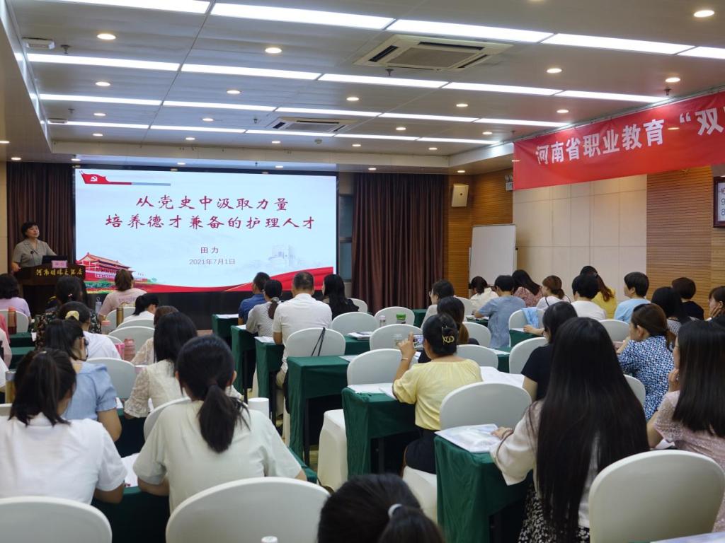 本网讯(文/张勇勤 图/蒋冠华)2021年7月1日上午,校党委委员、副校长田力为护理学院师生代表及河南省职业教育“双师型”教师培训班学员上党课。田力以《从党史中汲取力量培养德才兼备的护理人才》为题,为大家呈现了一场生动的爱党爱国教育课。党课由护理学院副院长秦元梅主持。