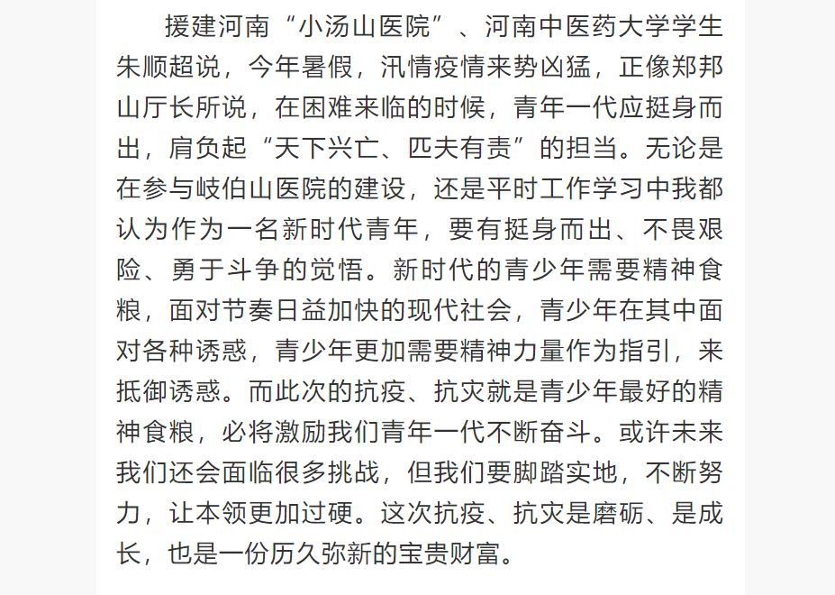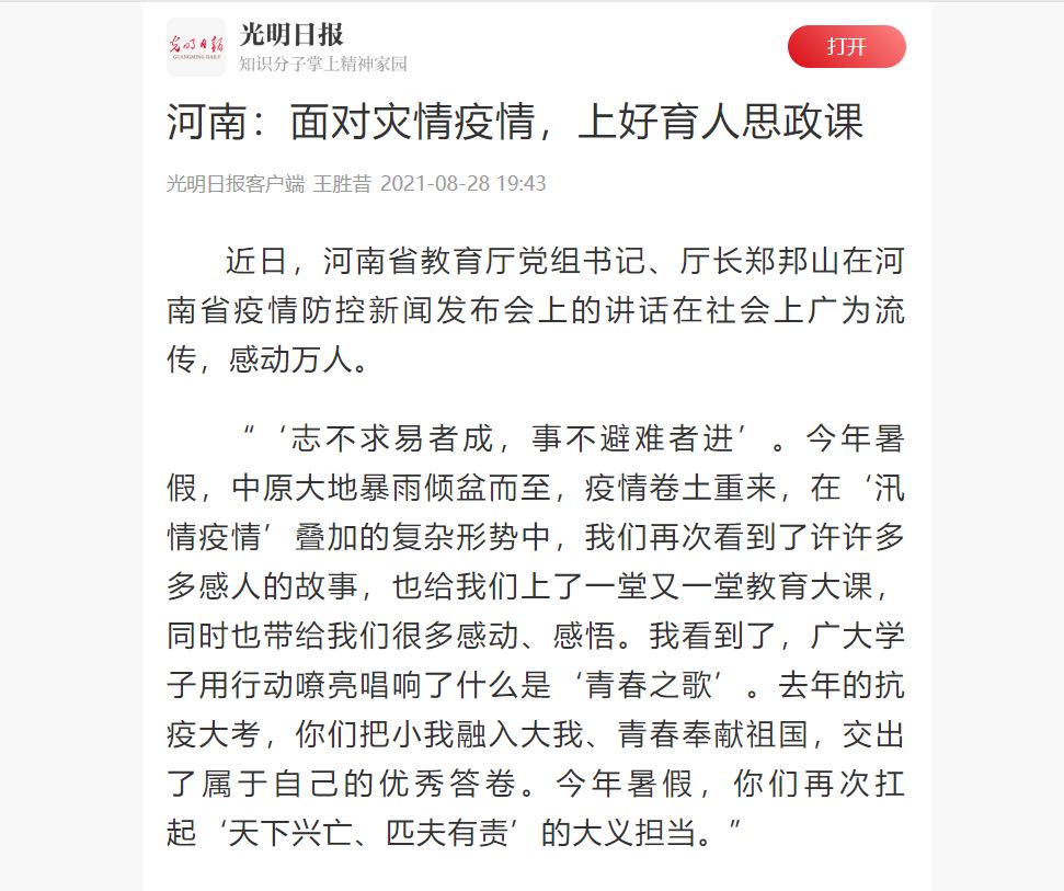 编者按:2021年8月28日,光明日报客户端对援建河南“小汤山医院”的leyu·乐鱼(中国)体育官方网站学子朱顺超对省教育厅党组书记、厅长郑邦山讲话的深刻感悟进行报道。现将部分文章刊发如下: