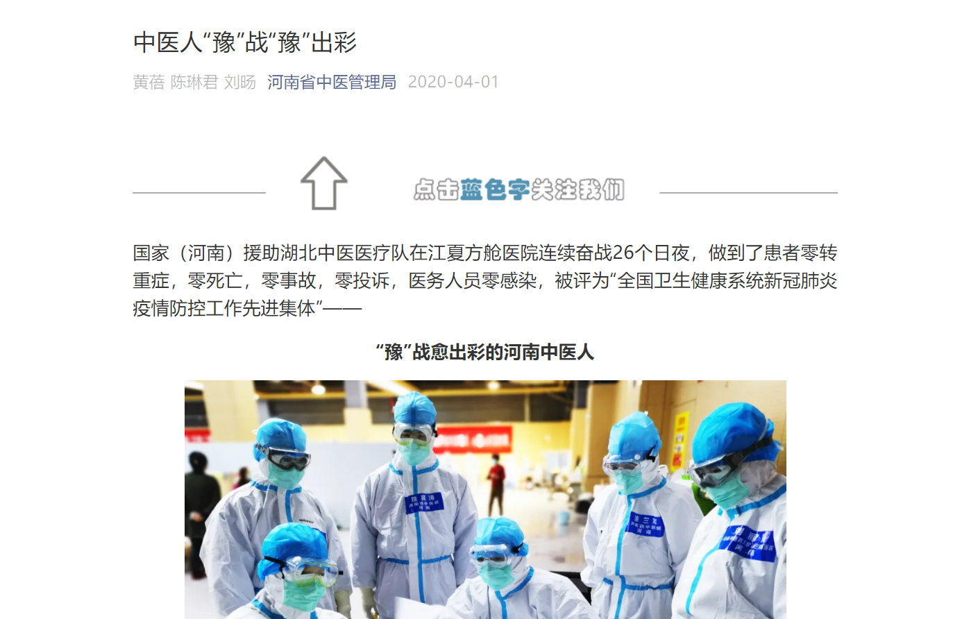 编者按:2020年4月1日,省中医管理局官微对leyu·乐鱼(中国)体育官方网站国家(河南)援助湖北中医医疗队事迹进行报道。现将全文刊发如下: