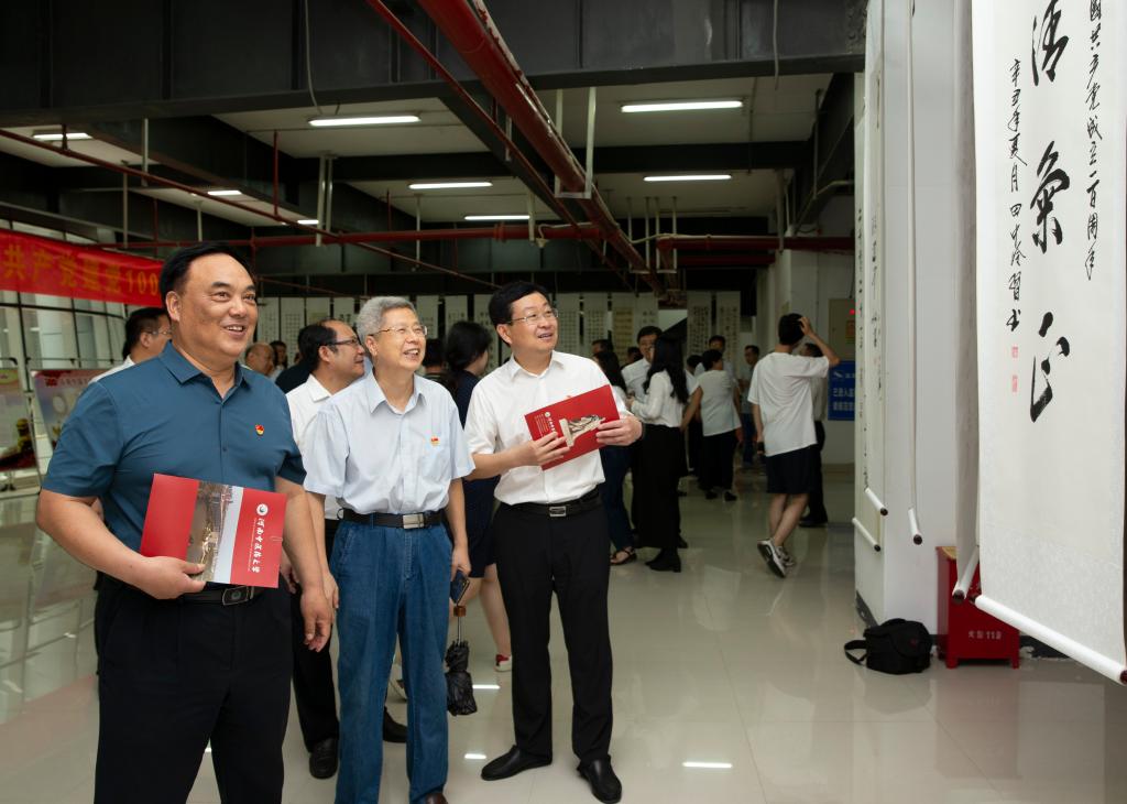 本网讯(文/赵会杰 贾姝 图/秦东仁)2021年6月29日上午,由校党委宣传部、离退休职工工作处、书画院等共同举办的“百年献礼 喜迎华诞”庆祝中国共产党成立100周年书画展在教学实验大楼6楼钢架结构大厅正式开展。校党委副书记、工会主席张小平,校纪委书记、监察专员王少玉出席开展仪式。原河南中医学院正院级调研员田中岭、校书画院院长朱忠宝、副院长王安邦及相关部门单位负责人、党员代表、教职工生代表等200余人参加仪式,仪式由校党委宣传部部长刘金厂主持。
