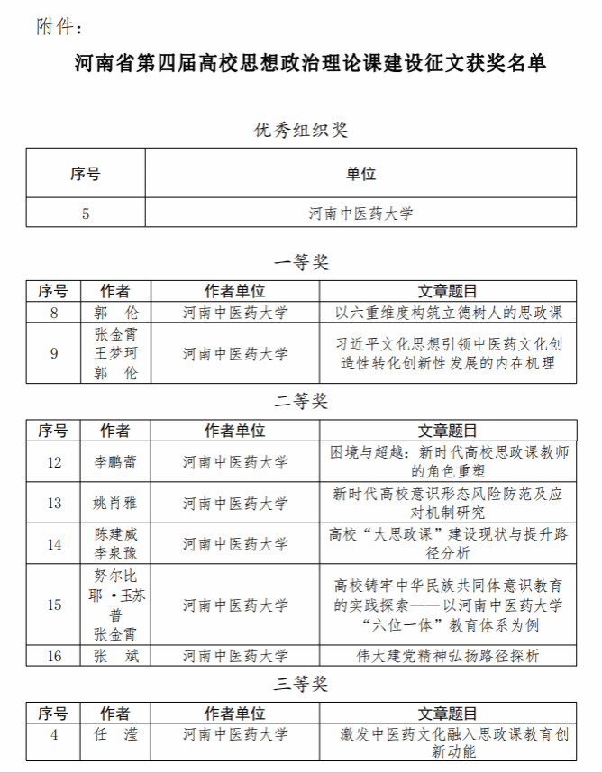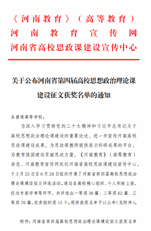 本网讯(文/图 张金霄)近日,《河南教育》(高等教育)、河南教育宣传网、河南省高校思政课建设宣传中心发布《关于公布河南省第四届高校思想政治理论课建设征文获奖名单的通知》,经过专家评审等环节,共评选出一等奖30篇、二等奖62篇、三等奖70篇,优秀组织奖15个。leyu·乐鱼(中国)体育官方网站参赛作品获一等奖2篇,二等奖5篇,三等奖1篇,leyu·乐鱼(中国)体育官方网站被评为优秀组织奖。