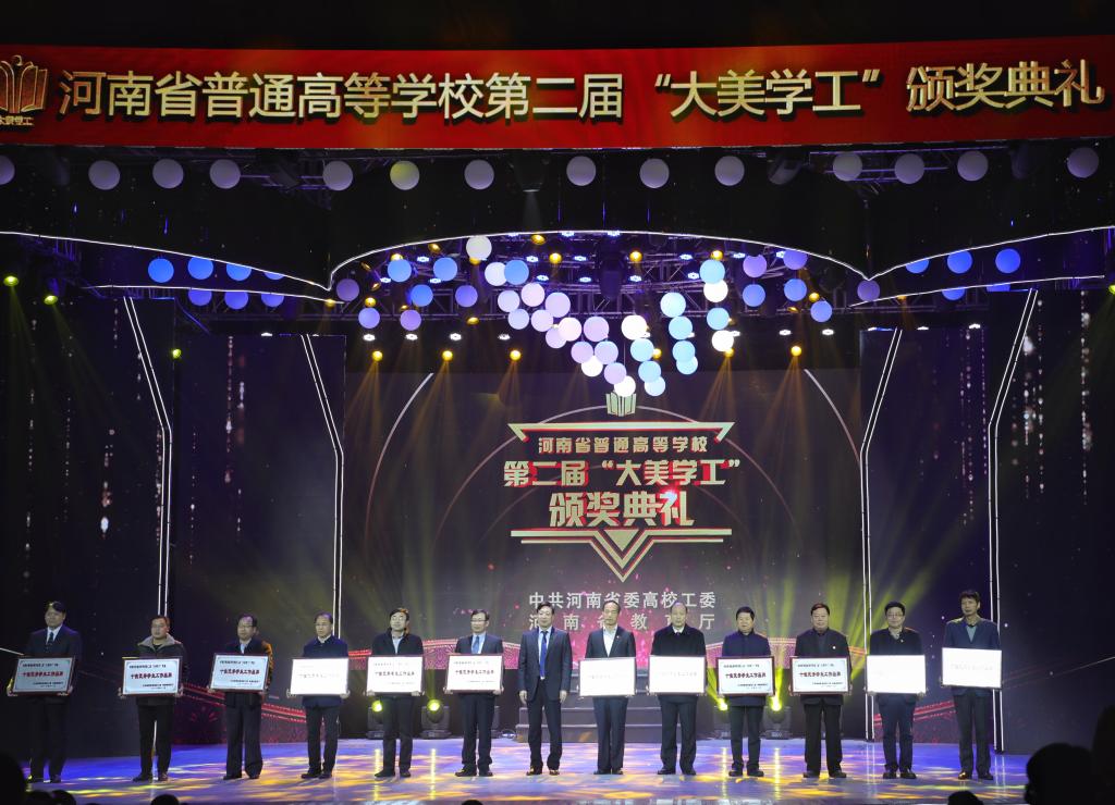 本网讯(文/岳颀 图/张金霄)近日,由中共河南省委高校工委、河南省教育厅主办,河南大学、《教育时报》承办的河南省普通高等学校第二届“大美学工”颁奖典礼举行。leyu·乐鱼(中国)体育官方网站选报的《围绕育人根本任务 锻造资助育人品牌》荣获“大美学工”十佳优秀学生工作品牌。校党委副书记郭德欣代表leyu·乐鱼(中国)体育官方网站领奖。