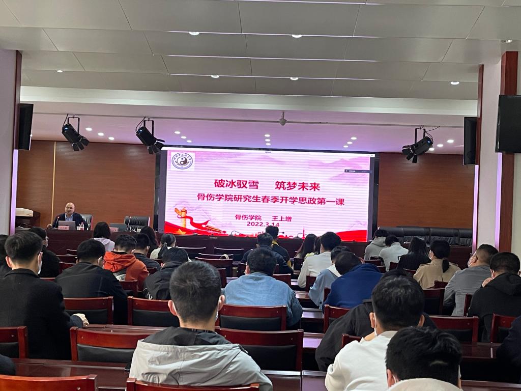 本网讯(文图/韩小飞)为深入学习习近平新时代中国特色社会主义思想,贯彻落实省委高校工委、省教育厅的通知要求及校党办《关于上好2022年春季开学思政第一课的通知》要求,结合leyu·乐鱼(中国)体育官方网站常态化疫情防控要求,经周密安排、精心准备,骨伤学院于2022年3月14日在东风路校区一楼会议室举办春季“开学思政第一课”,骨伤学院副院长王上增以《破冰驭雪 筑梦未来》为题,以线上线下相结合的方式为研究生进行授课,骨伤学院全体研究生参加了本次学习。