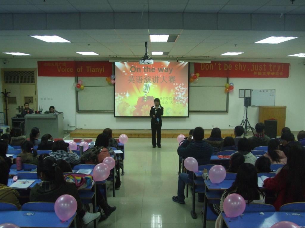 为了激发同学们的英语学习兴趣,2013年11月22日晚7点到9点,由外语学院分团委主办,外国文学研修会、天一之音联合承办的“On the way”英语演讲比赛决赛举行。外语学院王献竹老师、陈少峰老师、范文博老师及外教口语老师Ann Davies担任本次比赛的评委。