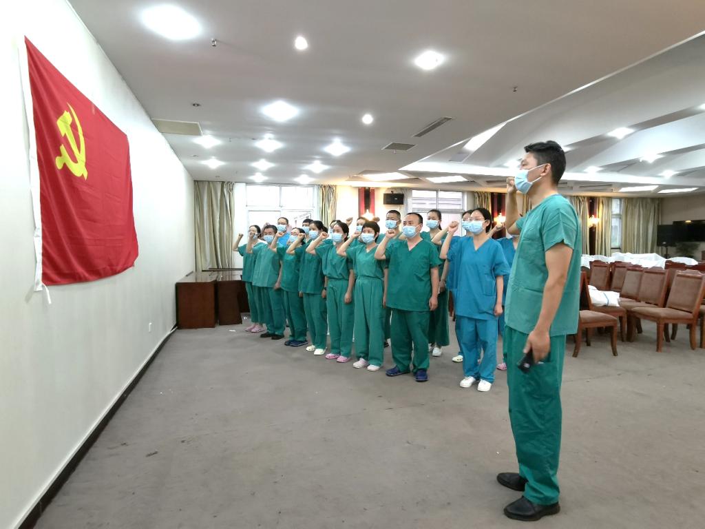 为在抗疫期间充分发挥党建引领作用,以党组织的凝聚力、号召力提升抗疫工作战斗力,经医院党委批复同意,一附院援驻马店医疗队临时党支部成立,由冯博同志担任临时党支部书记。冯博带领全体党员面向党旗庄严宣誓,重温入党誓词,坚定着一往无前、战之必胜的信心!