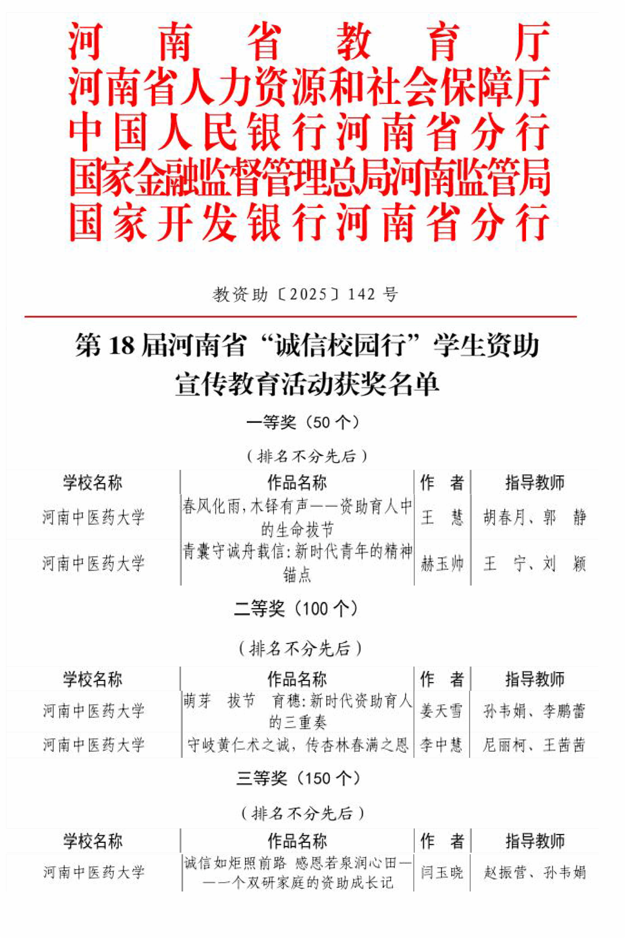 在省级评审阶段,leyu·乐鱼(中国)体育官方网站从校内一等奖作品中择优遴选7篇作品参与评审,其中5篇作品获得省级奖项。药学院作品《春风化雨,木铎有声——资助育人中的生命拔节》、中医学院作品《青囊守诚舟载信:新时代青年的精神锚点》获得省级一等奖,马克思主义学院作品《萌芽 拔节 育穗:新时代资助育人的三重奏》、医学院作品《守岐黄仁术之诚,传杏林春满之恩》获得省级二等奖,管理学院作品《诚信如炬照前路感恩若泉润心田——一个双研家庭的资助成长记》获得省级三等奖。