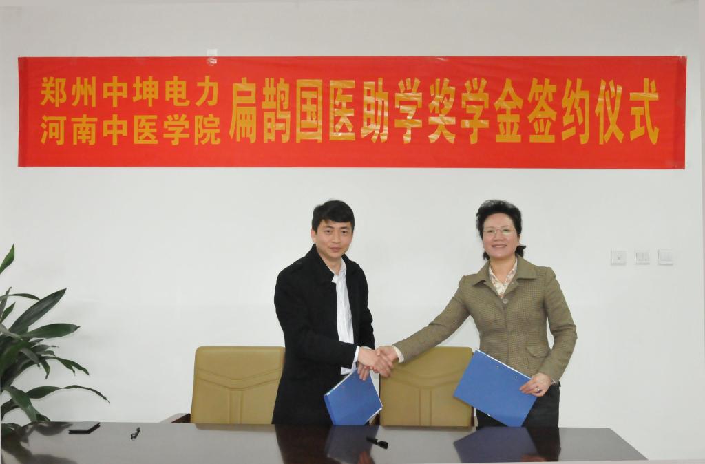 郑州中坤电力有限公司副总经理王胜育简要介绍了公司在王承志总经理带领下的创业、发展历程。王总还说,公司非常注重对祖国传统文化的学习和发扬,特别是对中医药文化的穿承和发展,设立扁鹊国医助学奖学金,不仅为公司提供了一个很好的校企合作机遇和为社会贡献绵薄之力的平台,今后通过不断交流,公司期待双方更加深入的合作。